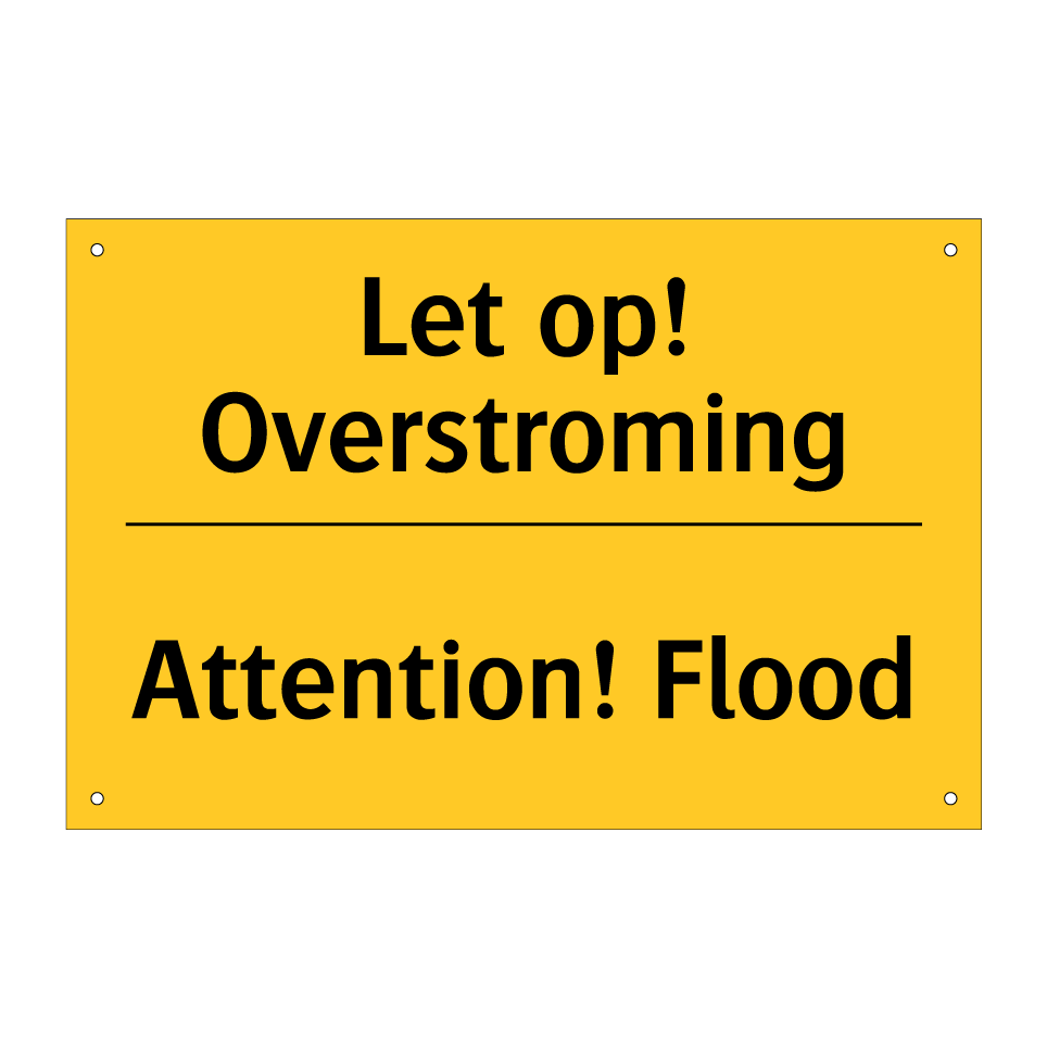 Waarschuwingsbord met de tekst Let op! Overstroming / Attention! Flood