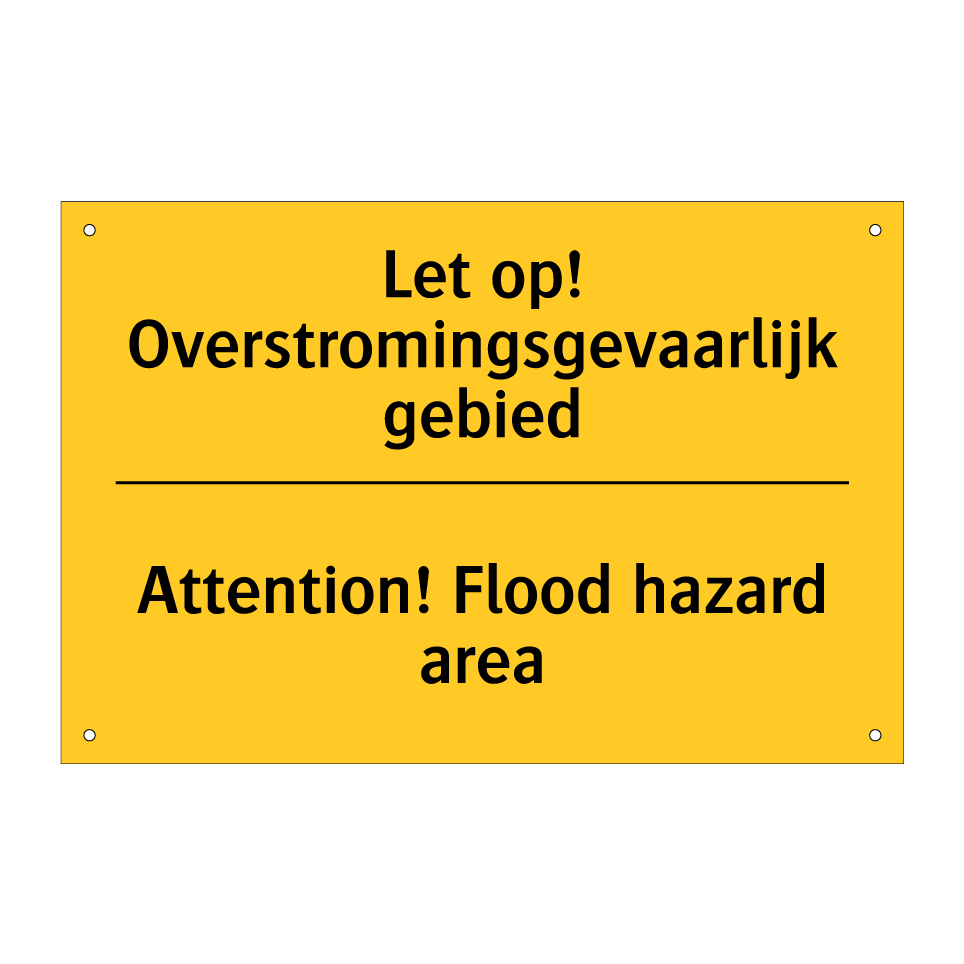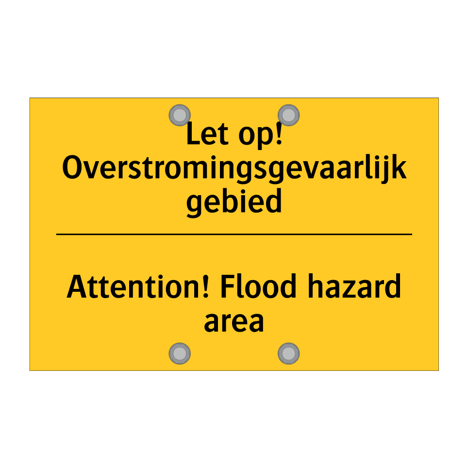 Waarschuwingsbord met de tekst Let op! Overstromingsgevaarlijk gebied / Attention! Flood hazard area