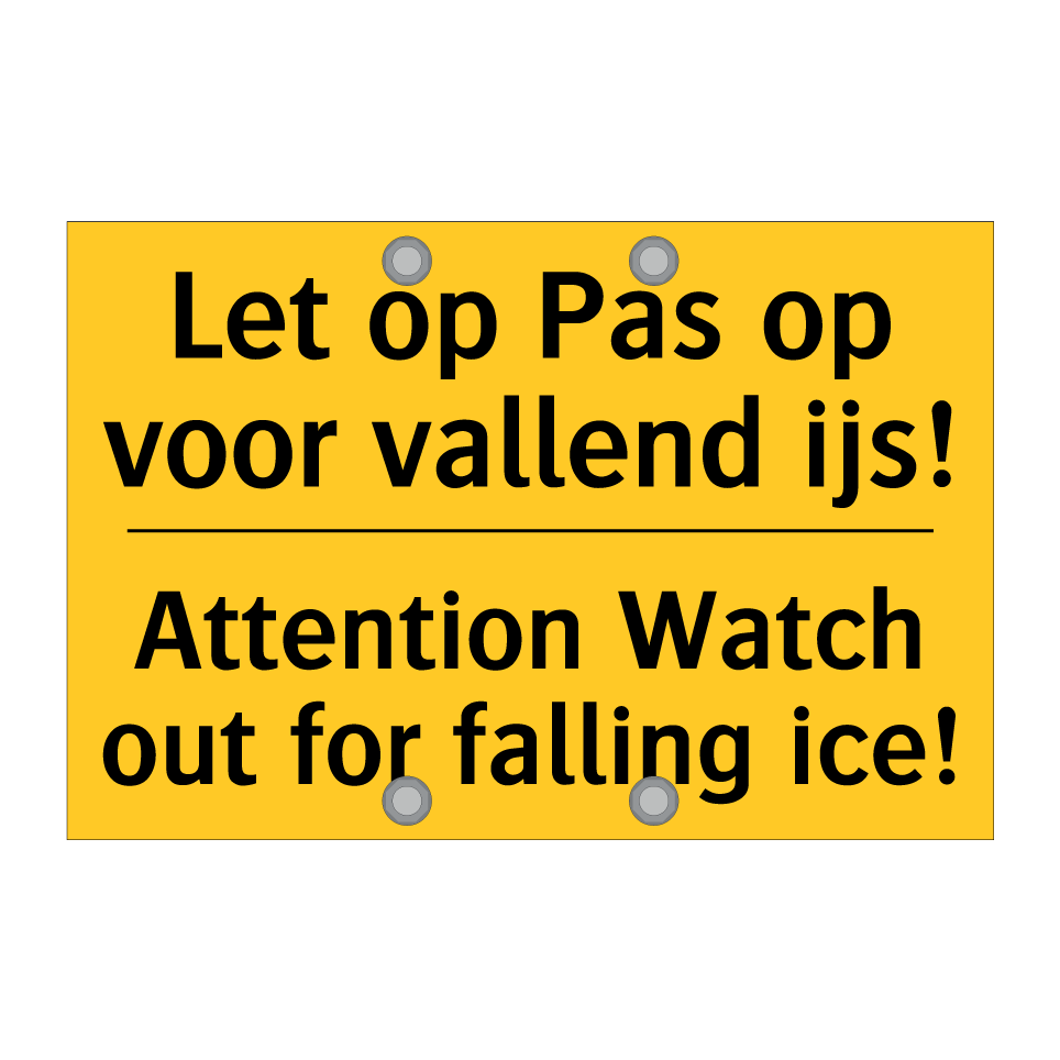 Waarschuwingsbord met de tekst Let op Pas op voor vallend ijs! / Attention Watch out for falling ice!