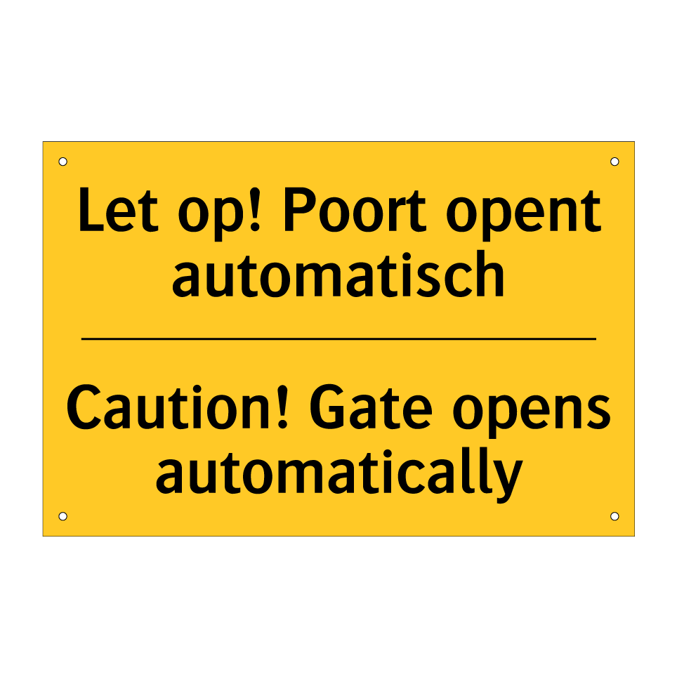 Waarschuwingsbord met de tekst Let op! Poort opent automatisch / Caution! Gate opens automatically