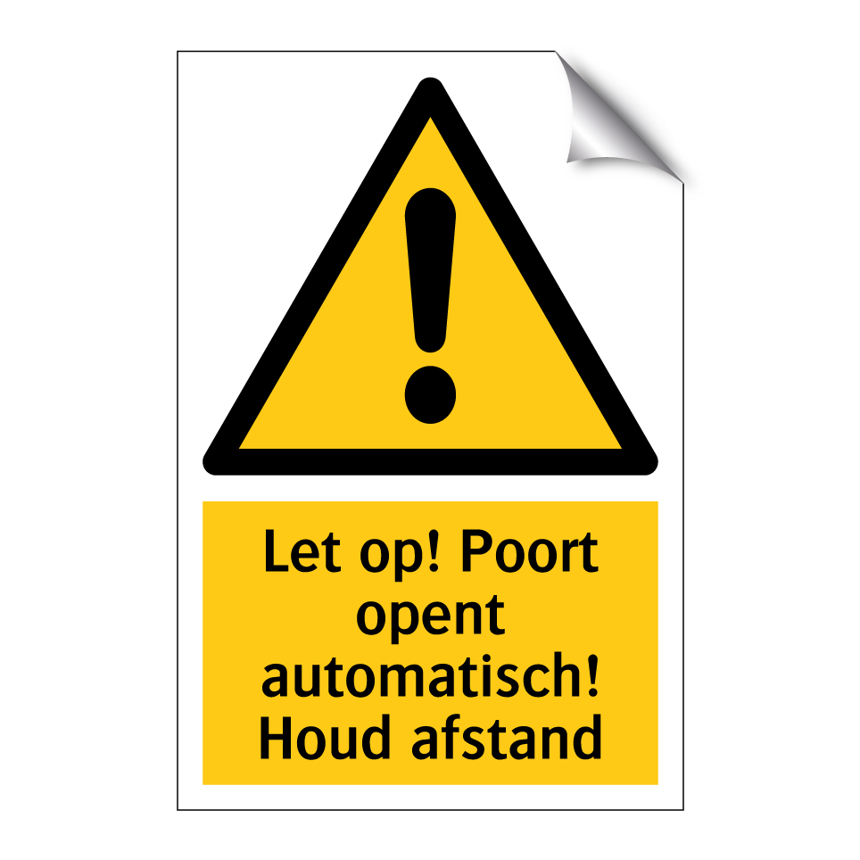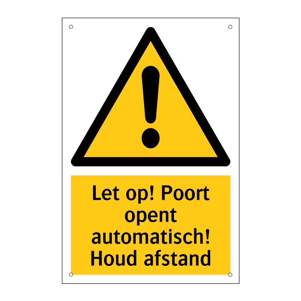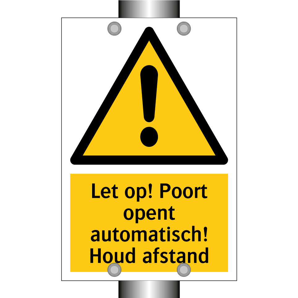 Waarschuwingsbord met de tekst Let op! Poort opent automatisch! Houd afstand