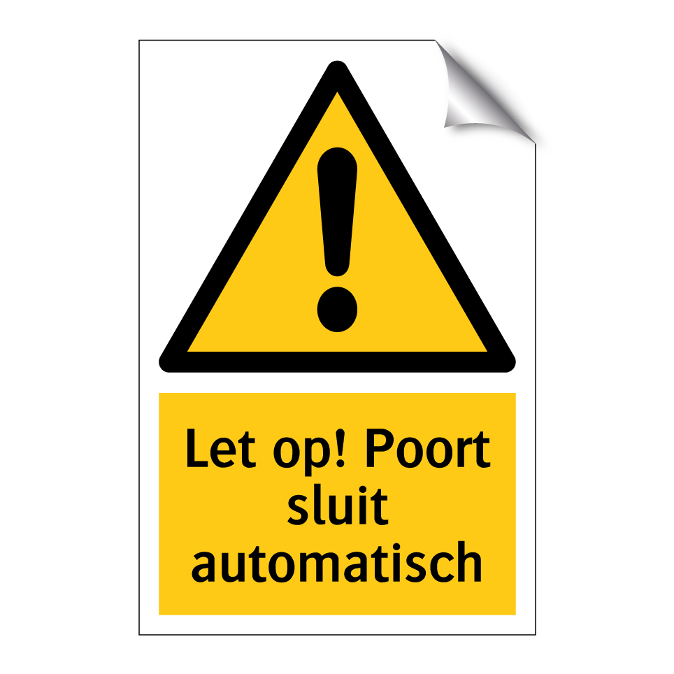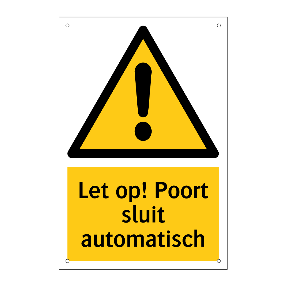 Waarschuwingsbord met de tekst Let op! Poort sluit automatisch