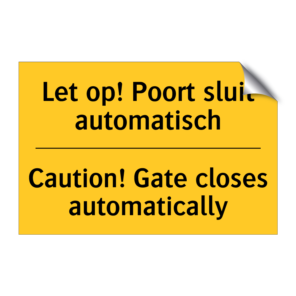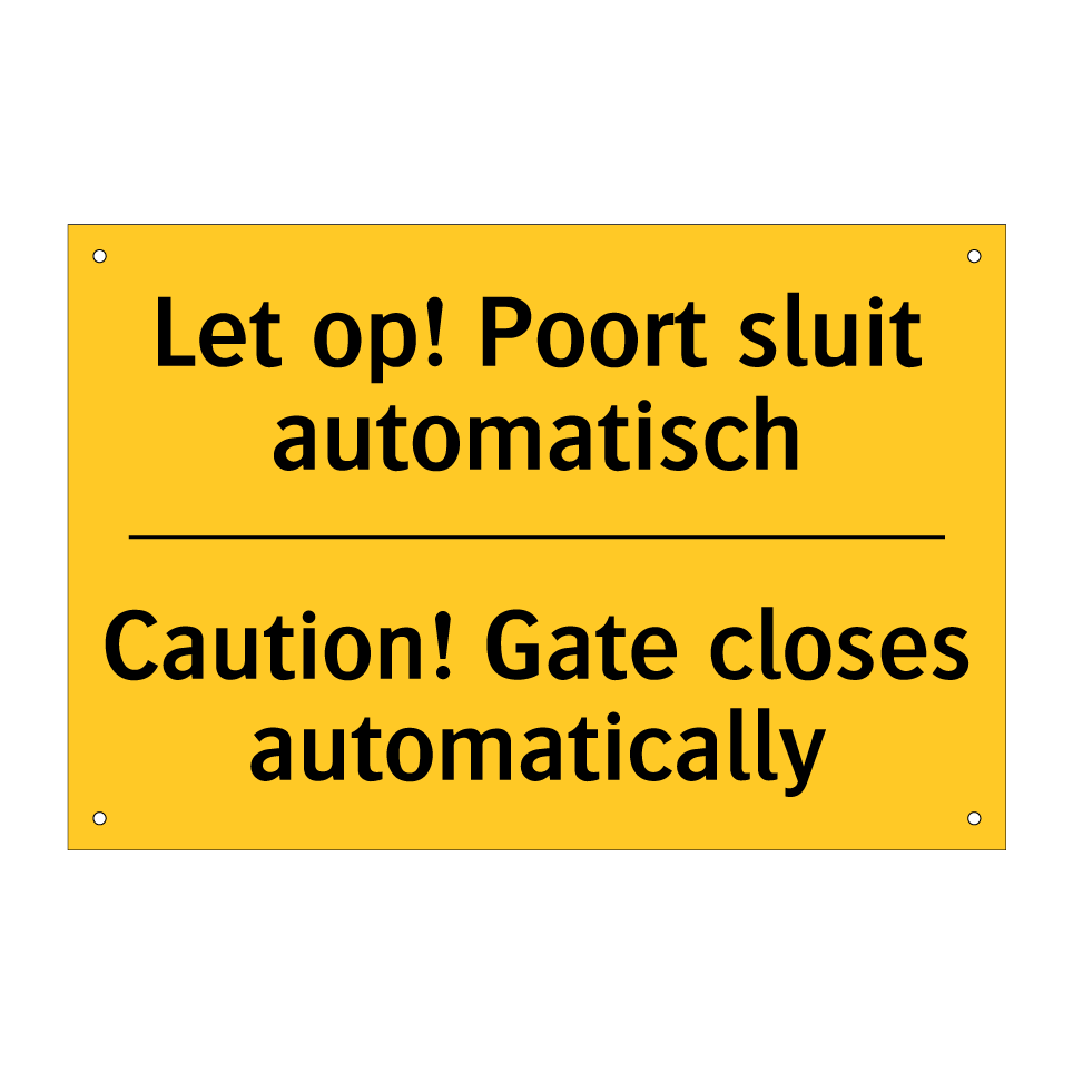 Waarschuwingsbord met de tekst Let op! Poort sluit automatisch / Caution! Gate closes automatically