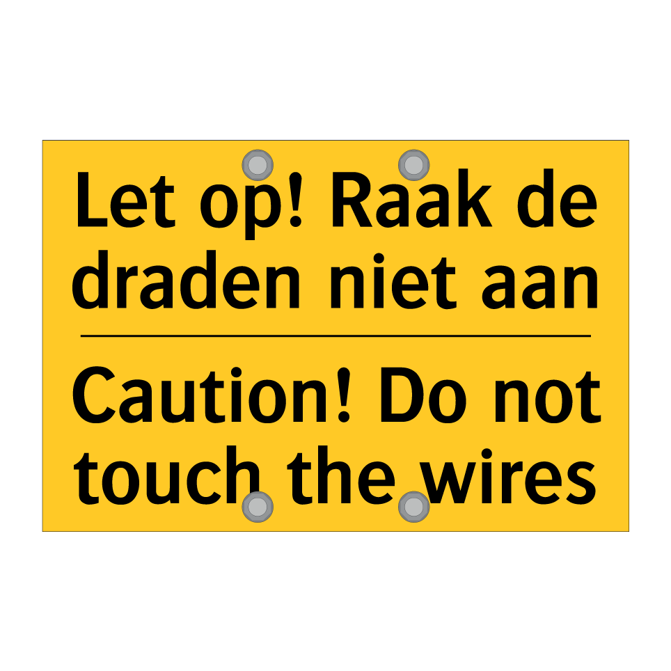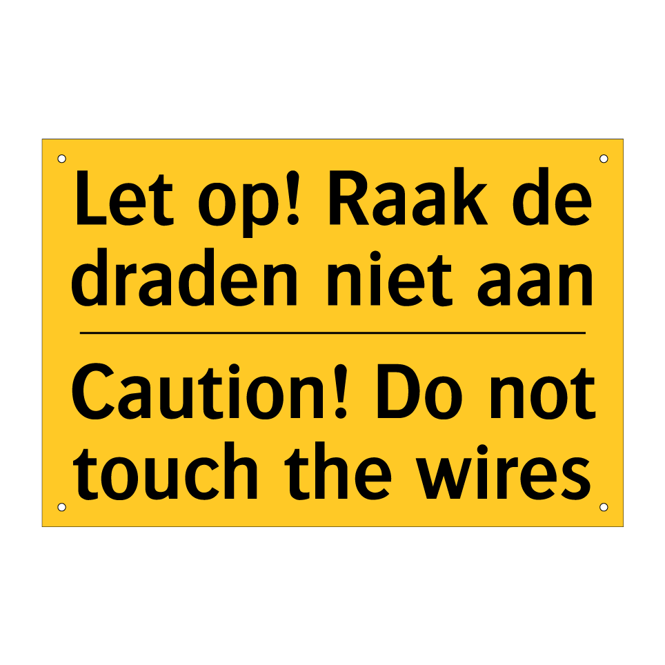 Waarschuwingsbord met de tekst Let op! Raak de draden niet aan / Caution! Do not touch the wires