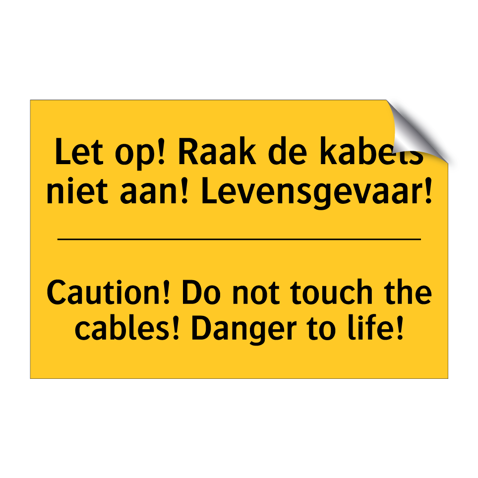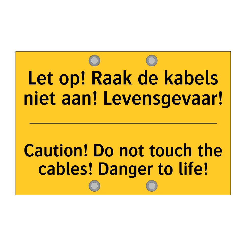 Waarschuwingsbord met de tekst Let op! Raak de kabels niet aan! Levensgevaar! / Caution! Do not touch the cables! Danger to life!