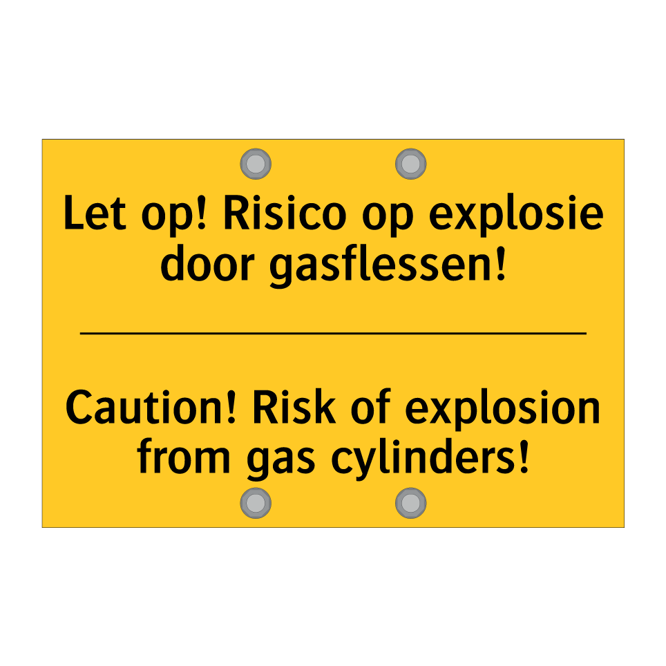 Waarschuwingsbord met de tekst Let op! Risico op explosie door gasflessen! / Caution! Risk of explosion from gas cylinders!