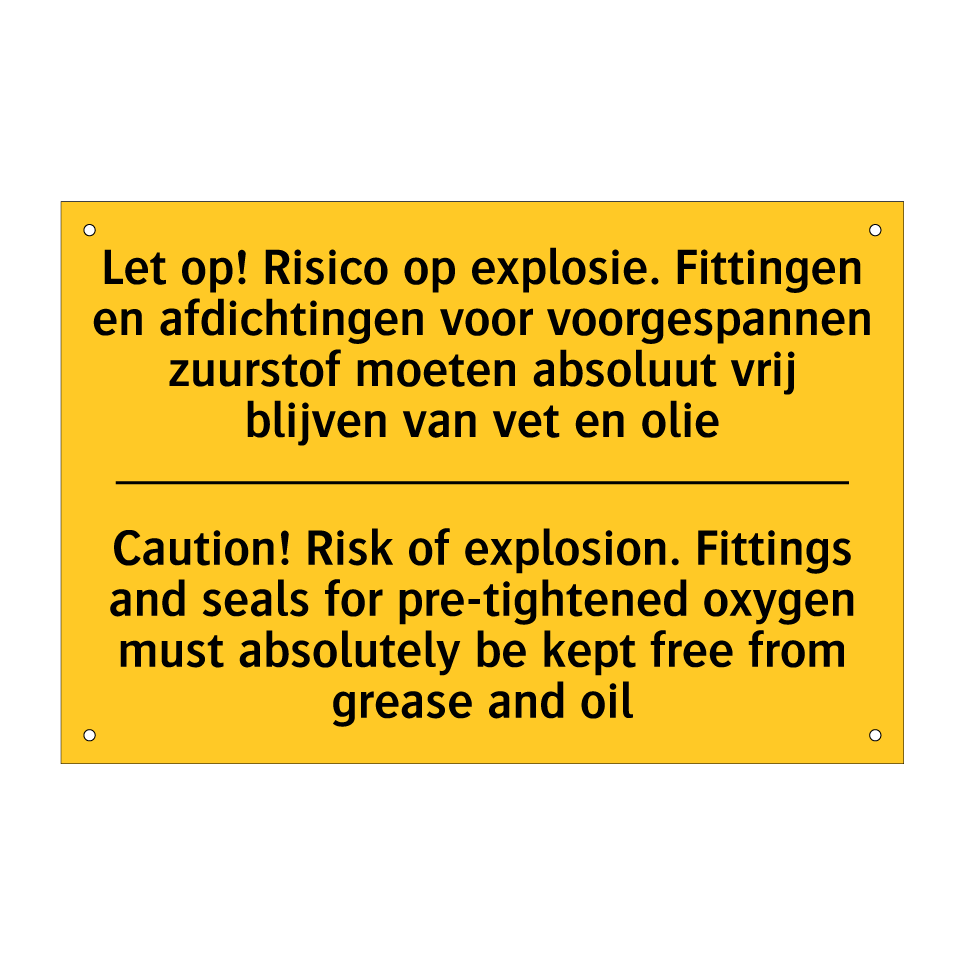 Waarschuwingsbord met de tekst Let op! Risico op explosie. Fittingen en afdichtingen voor voorgespannen zuurstof moeten absoluut vrij blijven van vet en olie / Caution! Risk of explosion. Fittings and seals for pre-tightened oxygen must absolutely be kept free from grease and oil