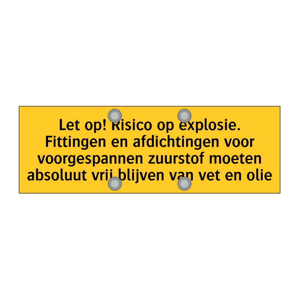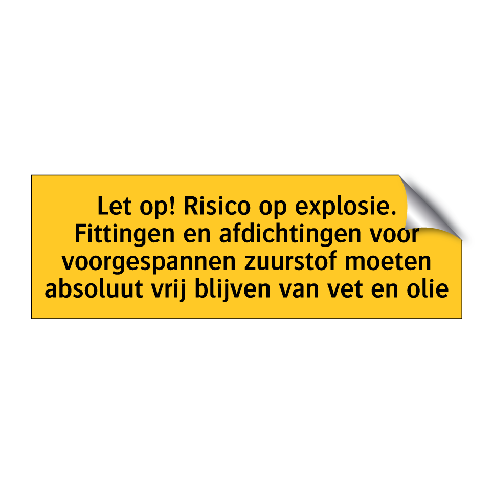 Waarschuwingsbord met de tekst Let op! Risico op explosie. Fittingen en afdichtingen voor voorgespannen zuurstof moeten absoluut vrij blijven van vet en olie