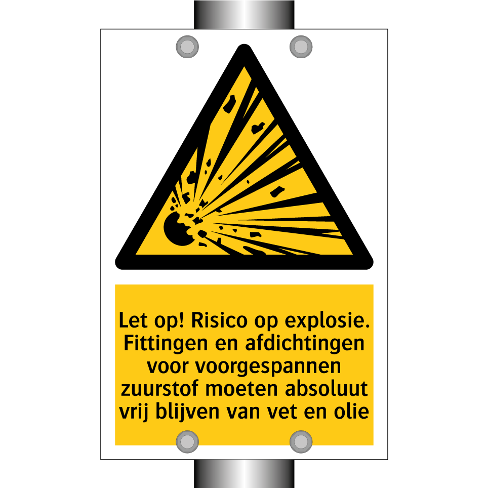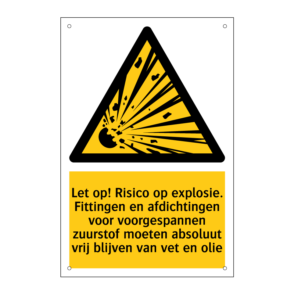 Waarschuwingsbord met de tekst Let op! Risico op explosie. Fittingen en afdichtingen voor voorgespannen zuurstof moeten absoluut vrij blijven van vet en olie