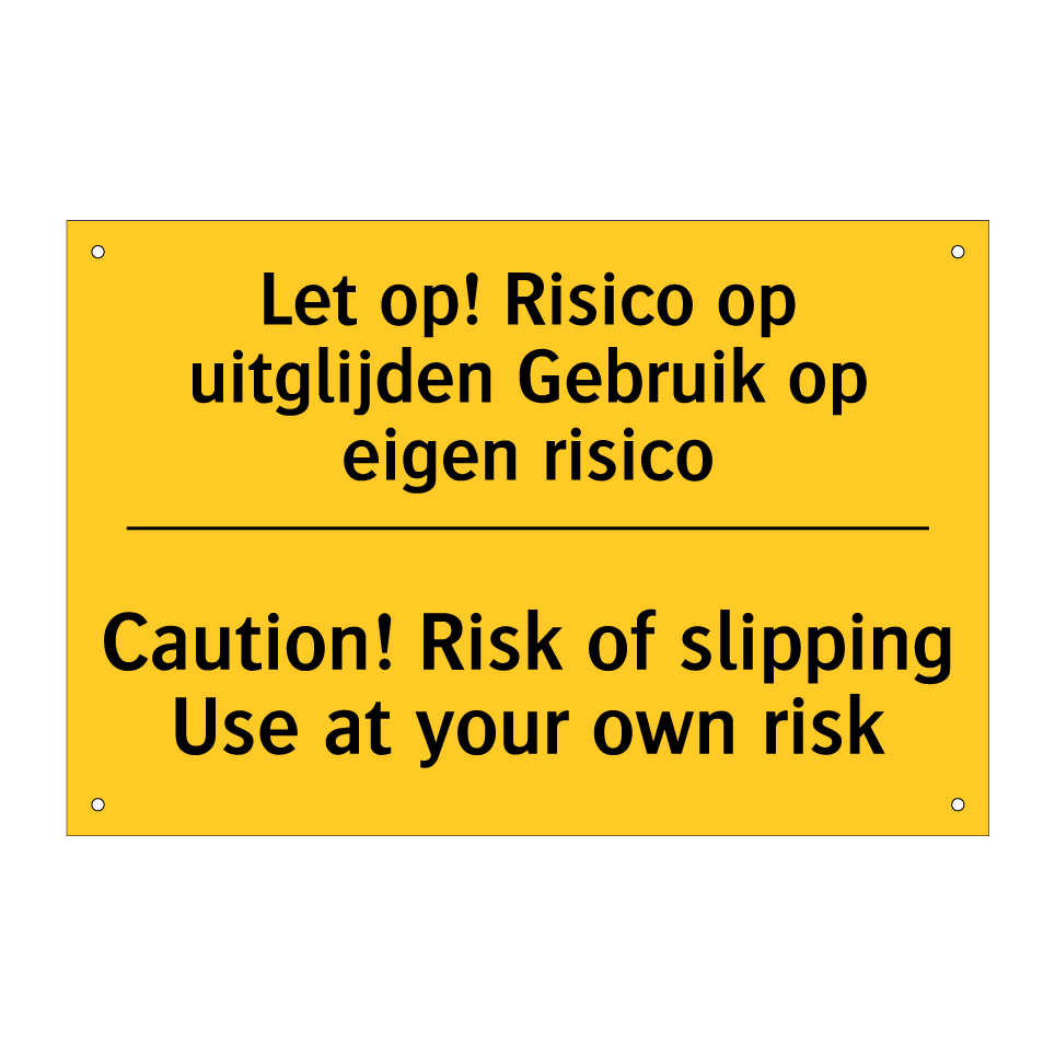 Waarschuwingsbord met de tekst Let op! Risico op uitglijden Gebruik op eigen risico / Caution! Risk of slipping Use at your own risk