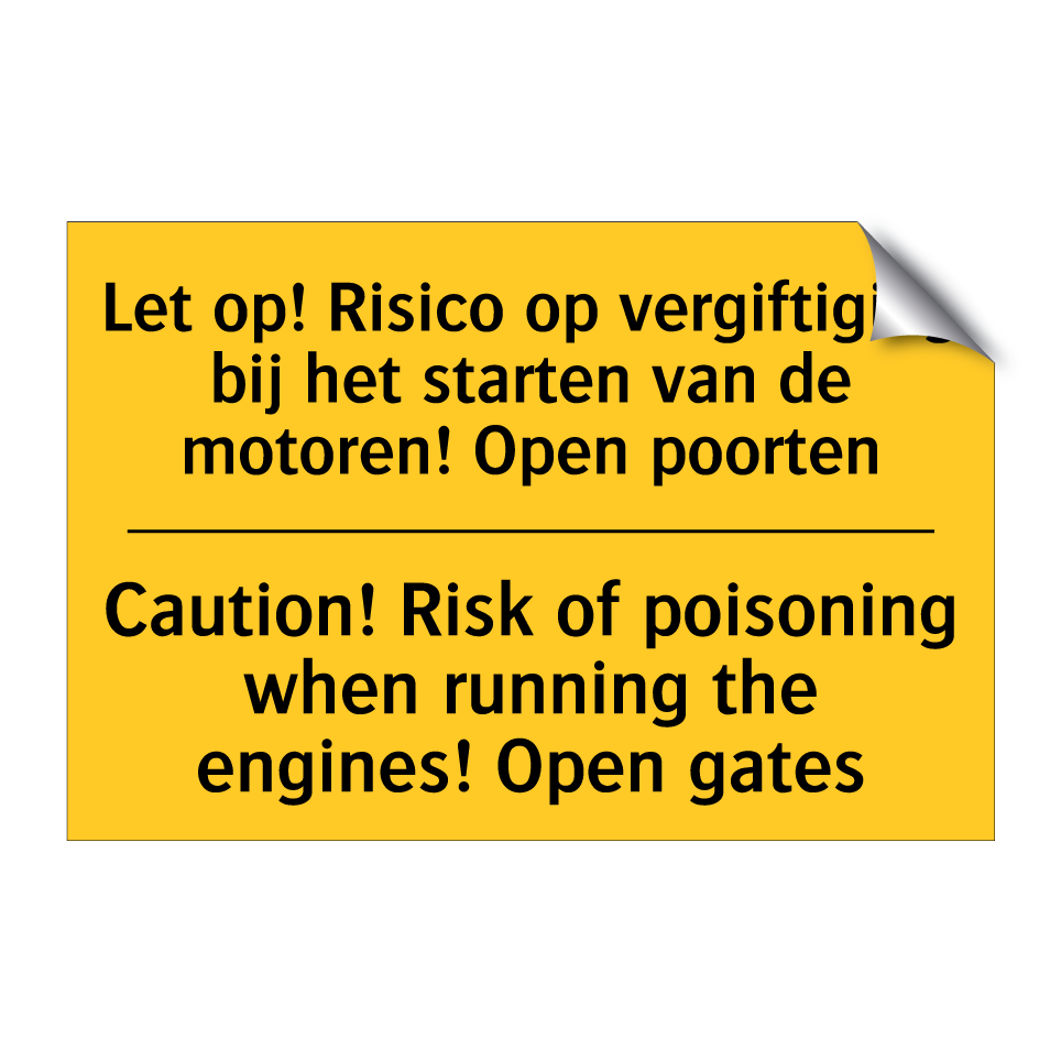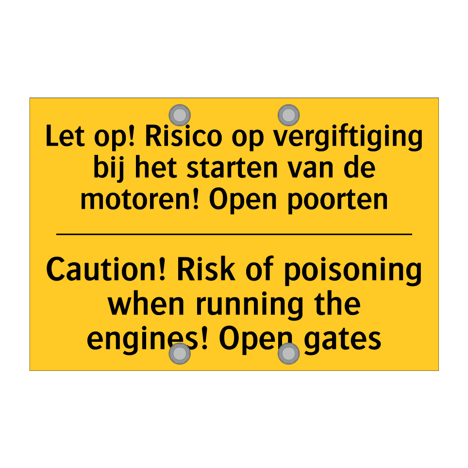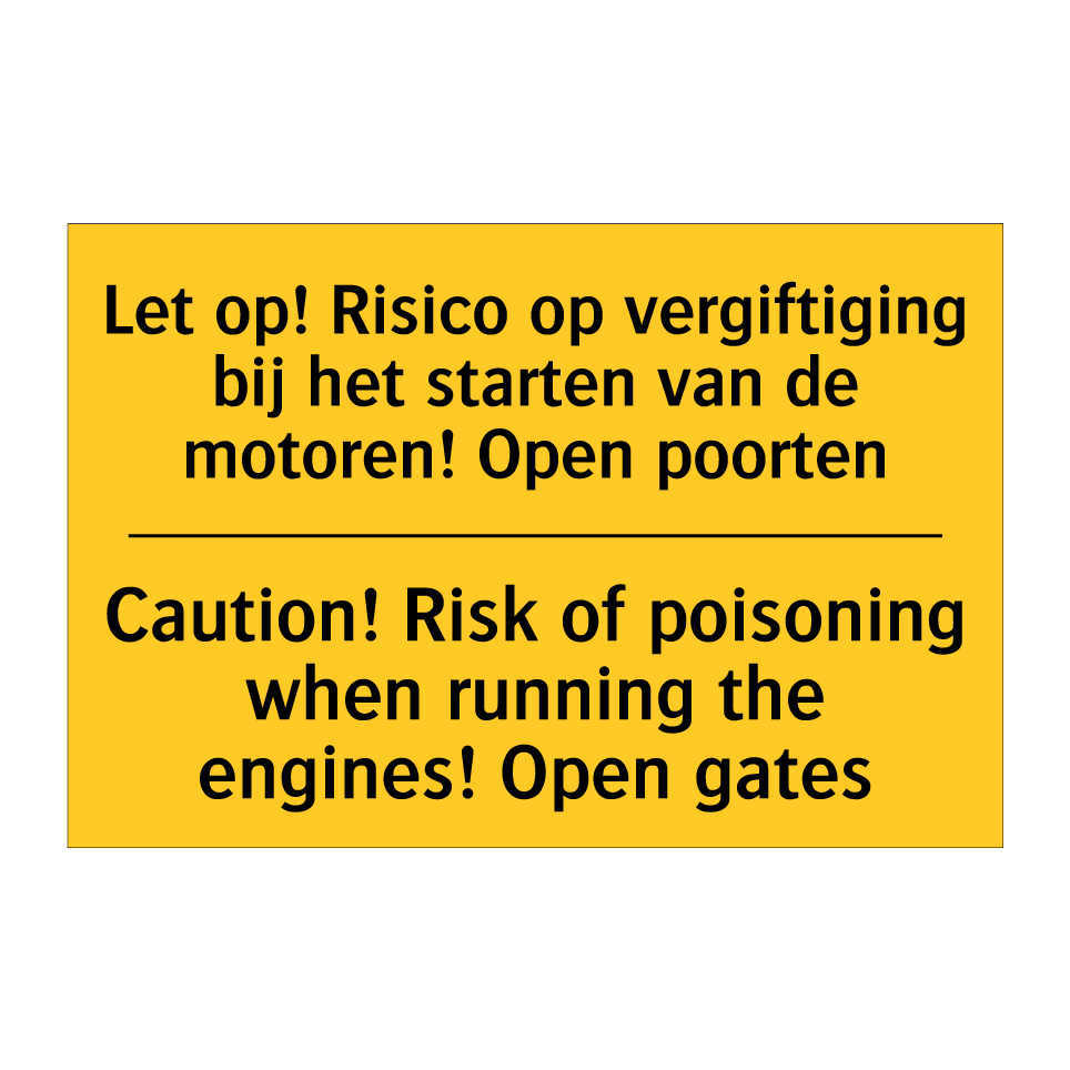 Waarschuwingsbord met de tekst Let op! Risico op vergiftiging bij het starten van de motoren! Open poorten / Caution! Risk of poisoning when running the engines! Open gates