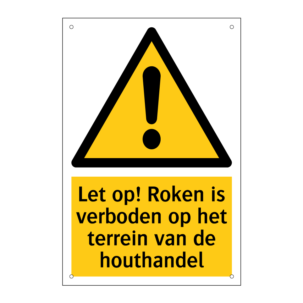 Waarschuwingsbord met de tekst Let op! Roken is verboden op het terrein van de houthandel