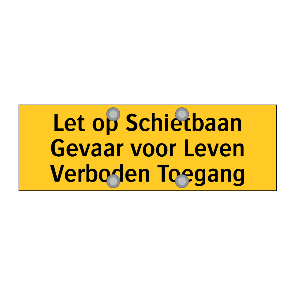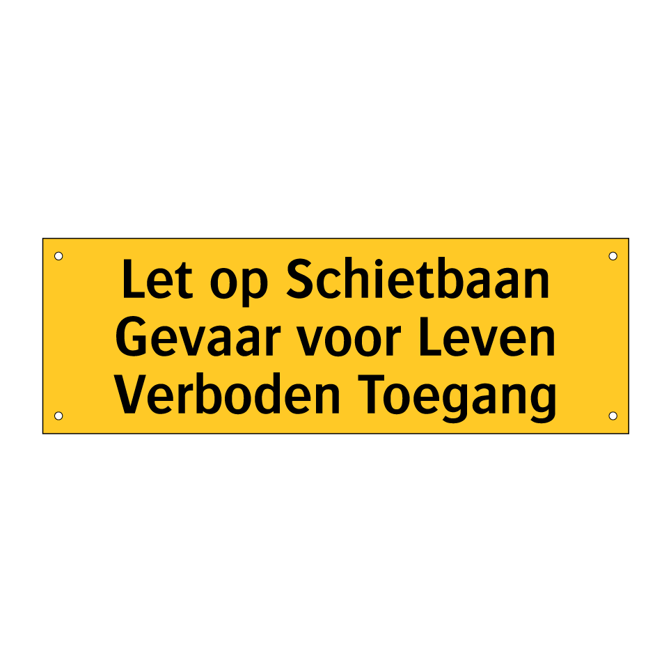 Waarschuwingsbord met de tekst Let op Schietbaan Gevaar voor Leven Verboden Toegang