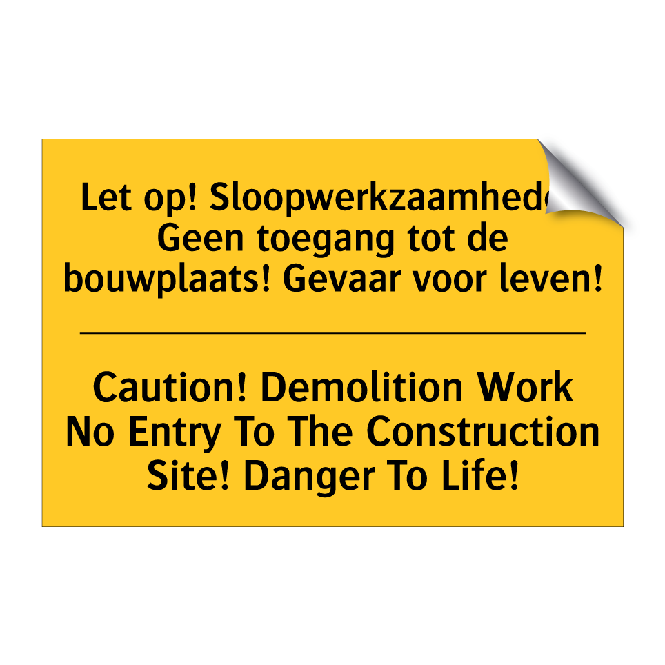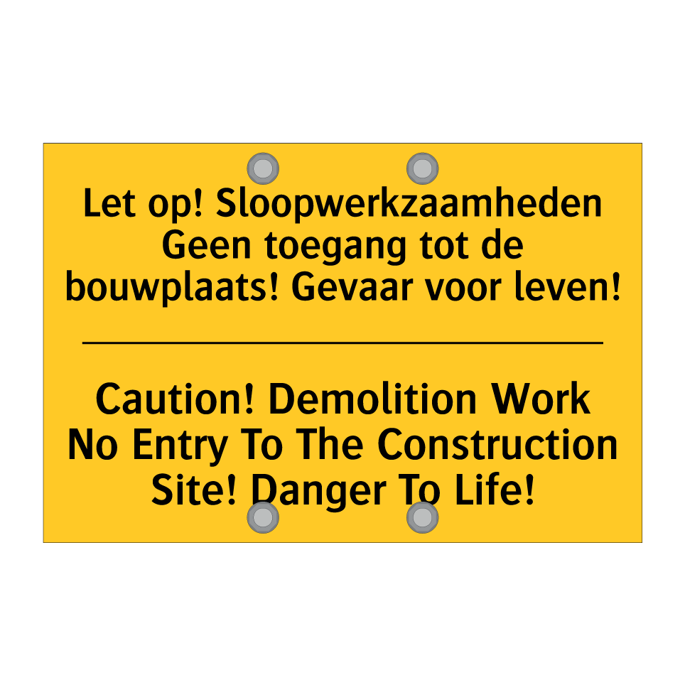 Waarschuwingsbord met de tekst Let op! Sloopwerkzaamheden Geen toegang tot de bouwplaats! Gevaar voor leven! / Caution! Demolition Work No Entry To The Construction Site! Danger To Life!