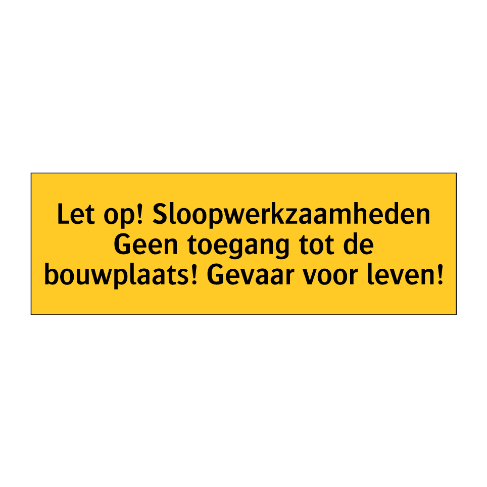 Deze waarschuwingsbord is essentieel voor bouwplaatsen waar sloopwerkzaamheden plaatsvinden. Het dient om onbevoegden te waarschuwen voor de gevaren die gepaard gaan met het betreden van de bouwplaats. Plaats deze bord op goed zichtbare locaties zoals ingangen, hekken of andere toegangswegen om ervoor te zorgen dat iedereen op de hoogte is van de risico's. Dit waarschuwingsbord met zijn opvallende gele achtergrond en zwarte tekst trekt onmiddellijk de aandacht en helpt ongelukken te voorkomen. Ideaal voor gebruik in zowel stedelijke als landelijke bouwomgevingen, biedt dit bordje een duidelijke en directe waarschuwing voor levensgevaarlijke situaties.