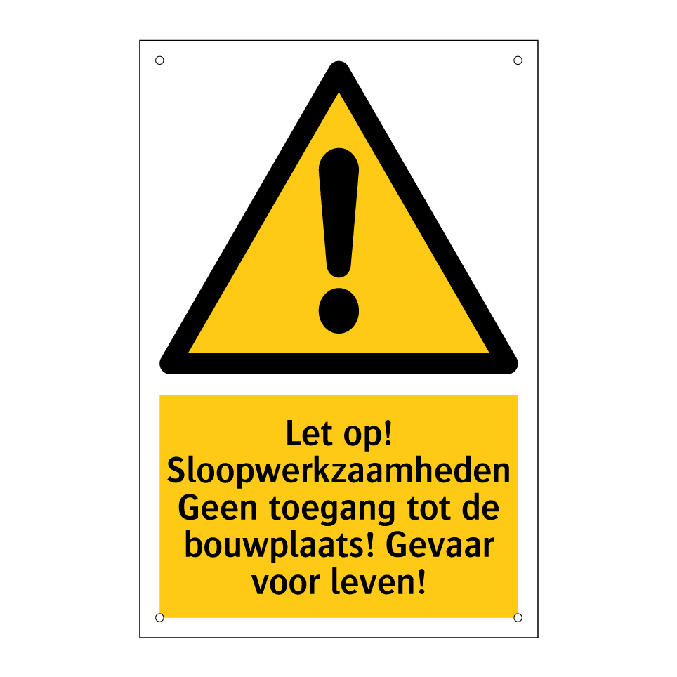 Waarschuwingsbord met de tekst Let op! Sloopwerkzaamheden Geen toegang tot de bouwplaats! Gevaar voor leven!