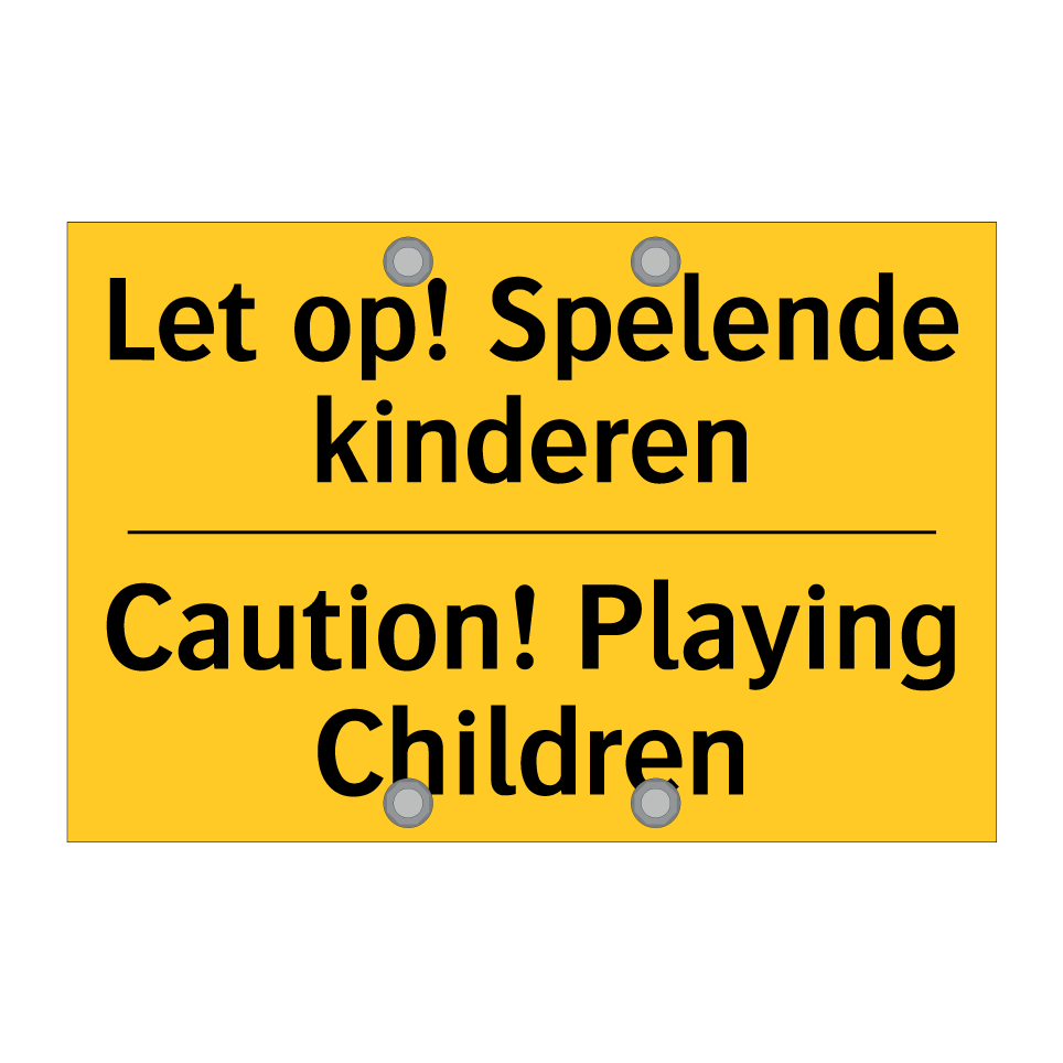 Dit waarschuwingsbord met een gele achtergrond en zwarte tekst is ideaal voor het waarborgen van de veiligheid van spelende kinderen. De tweetalige tekst in zowel Nederlands als Engels maakt het bord geschikt voor internationale omgevingen, zoals toeristische gebieden, campings en recreatieparken. Plaats dit bordje in woonwijken, speeltuinen of schoolzones om automobilisten en voorbijgangers te waarschuwen voor spelende kinderen. Door de duidelijke en opvallende kleuren trekt het bord direct de aandacht, wat bijdraagt aan een verhoogde veiligheid. Dit waarschuwingsbord is een essentiële toevoeging voor elke plek waar kinderen spelen en extra voorzichtigheid geboden is.