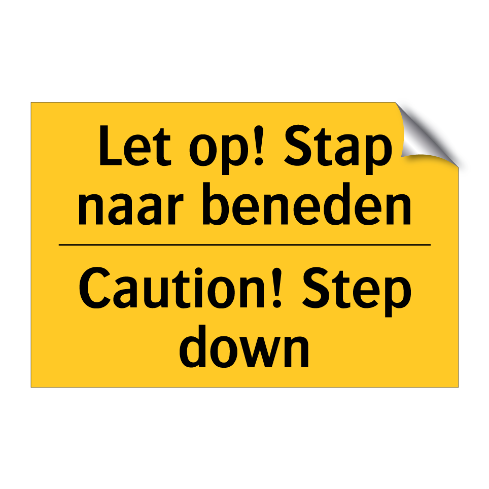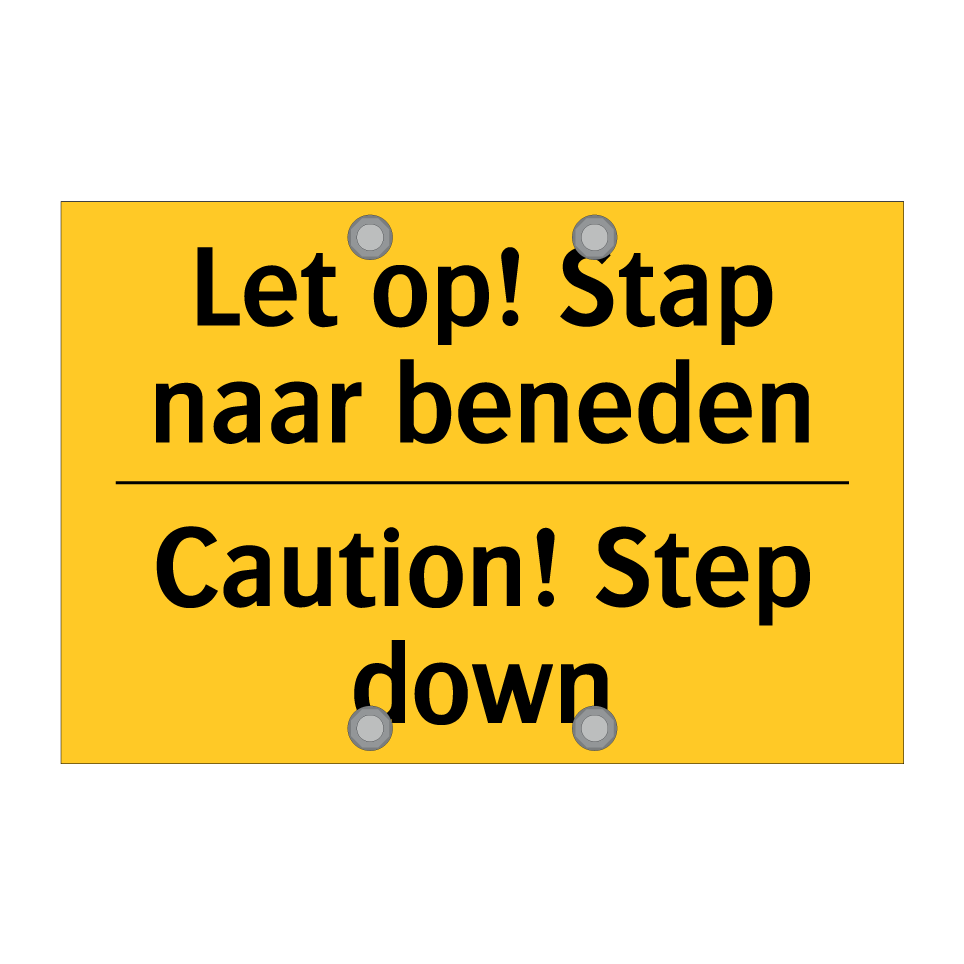 Waarschuwingsbord met de tekst Let op! Stap naar beneden / Caution! Step down