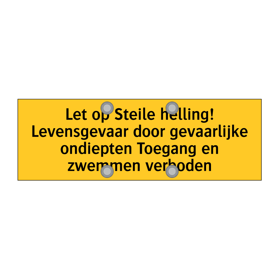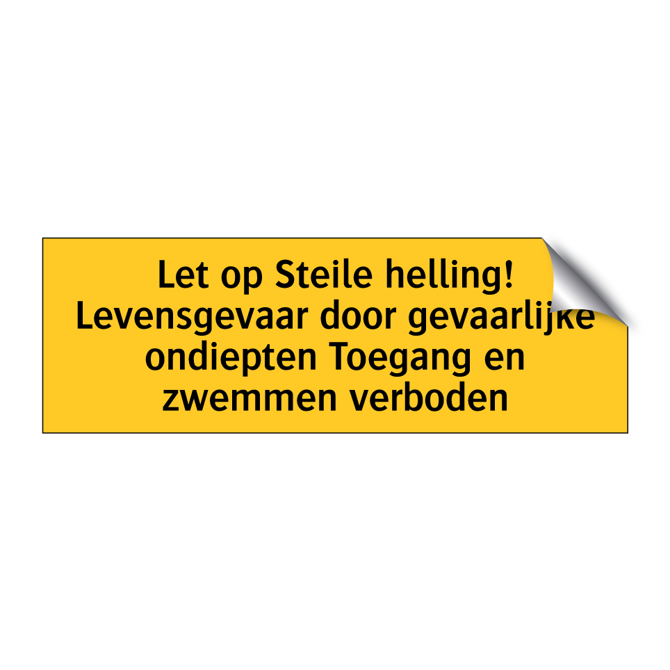 Deze waarschuwingsbord is essentieel voor het waarborgen van de veiligheid in gebieden met steile hellingen en gevaarlijke ondiepten. Plaats deze bord op strategische locaties zoals bij waterkanten, zwemplaatsen, en toegangswegen naar risicovolle terreinen om bezoekers te waarschuwen voor levensgevaarlijke situaties. dit bordje is ideaal voor gebruik in recreatiegebieden, natuurreservaten, en bouwplaatsen waar de kans op ongelukken groot is. Door de opvallende gele achtergrond en zwarte tekst trekt het direct de aandacht en zorgt het ervoor dat de boodschap duidelijk en onmiskenbaar is. Zorg voor een veilige omgeving door deze waarschuwingsbord op de juiste plekken te installeren.