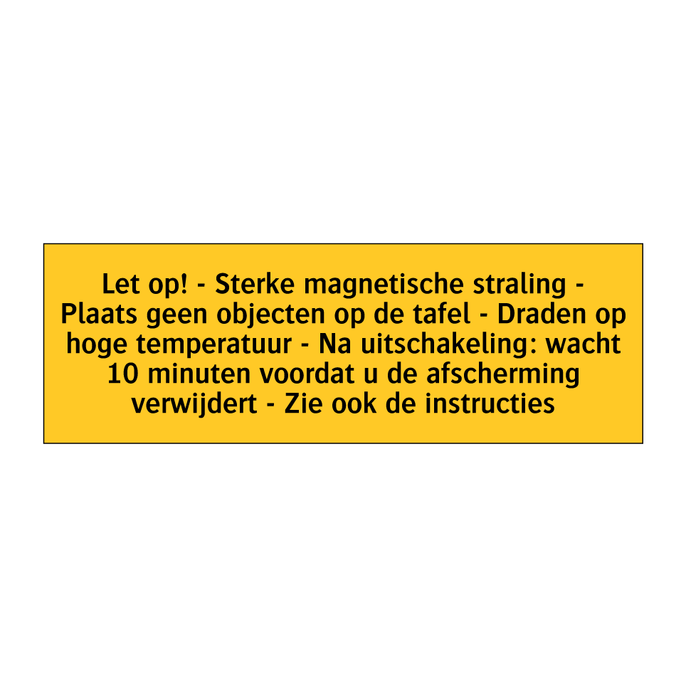 Waarschuwingsbord met de tekst Let op! - Sterke magnetische straling - Plaats geen objecten op de tafel - Draden op hoge temperatuur - Na uitschakeling: wacht 10 minuten voordat u de afscherming verwijdert - Zie ook de instructies