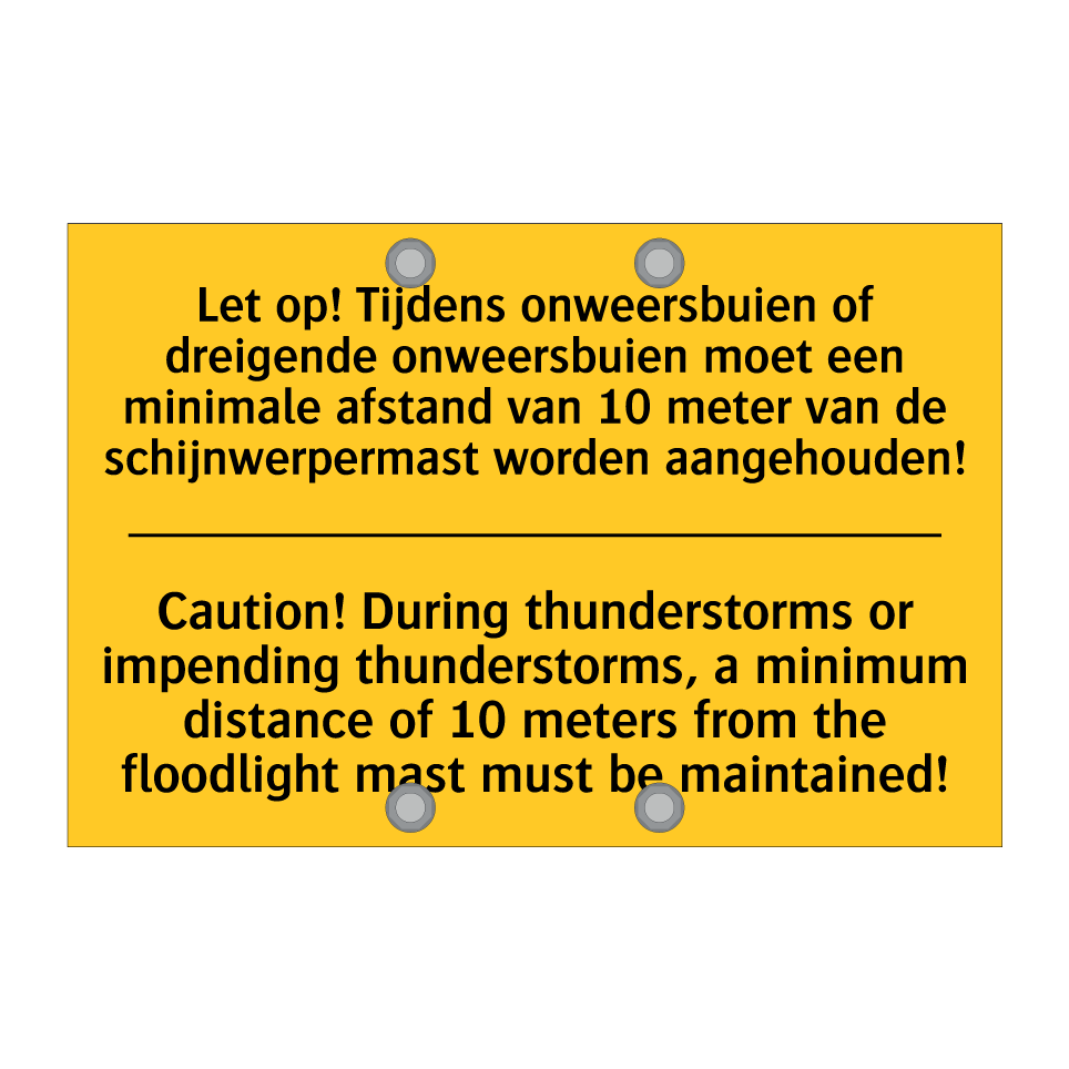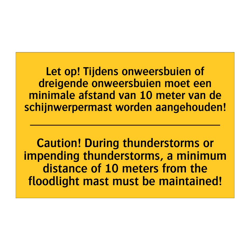 Waarschuwingsbord met de tekst Let op! Tijdens onweersbuien of dreigende onweersbuien moet een minimale afstand van 10 meter van de schijnwerpermast worden aangehouden! / Caution! During thunderstorms or impending thunderstorms, a minimum distance of 10 meters from the floodlight mast must be maintained!
