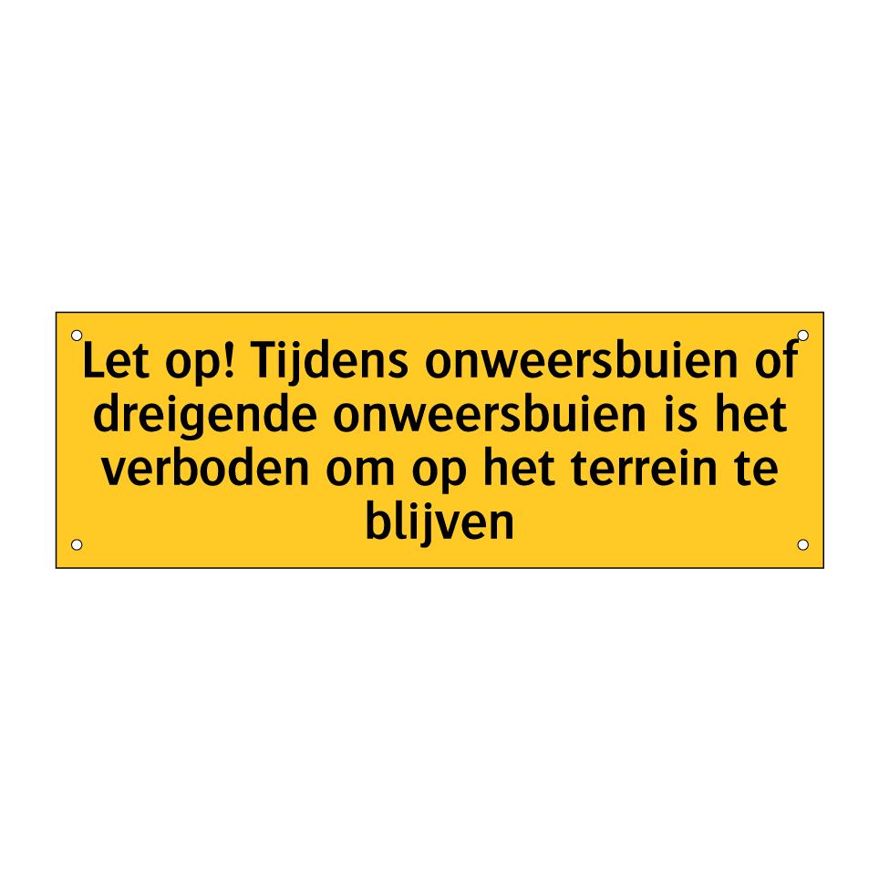 Deze waarschuwingsbord is essentieel voor de veiligheid op uw terrein. Het waarschuwt bezoekers en medewerkers om het terrein te verlaten tijdens onweersbuien of dreigende onweersbuien. Plaats deze bord op strategische locaties zoals ingangen, parkeerplaatsen, en andere drukbezochte gebieden om ervoor te zorgen dat iedereen op de hoogte is van de gevaren. dit bordje is ideaal voor campings, recreatieparken, bouwplaatsen en andere buitenlocaties waar mensen zich kunnen bevinden. Door de opvallende gele achtergrond en zwarte tekst is de boodschap duidelijk en goed zichtbaar, zelfs van een afstand. Zorg voor een veilige omgeving door deze waarschuwingsbord te gebruiken.