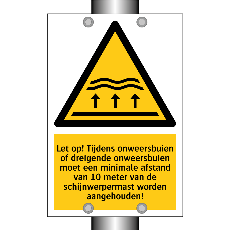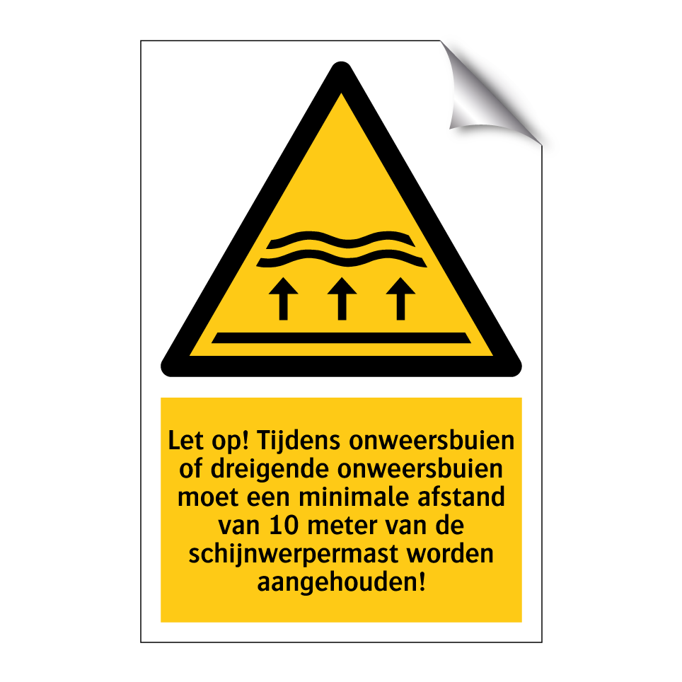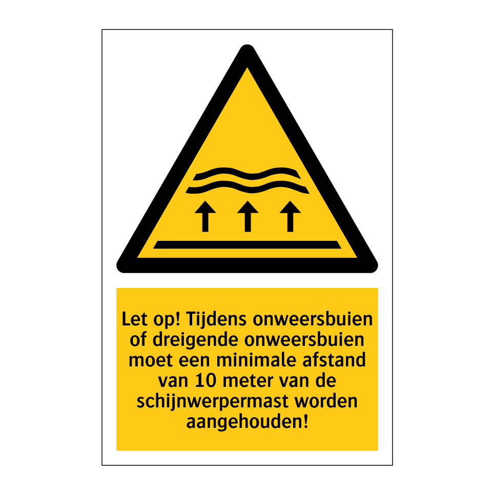 Deze waarschuwingsbord is essentieel voor de veiligheid rondom schijnwerpermasten tijdens onweer. Het bord waarschuwt mensen om een veilige afstand van minimaal 10 meter te bewaren bij dreigend onweer. Ideaal voor sportvelden, bouwplaatsen, en andere buitenlocaties waar schijnwerpermasten aanwezig zijn. Door deze waarschuwingsbord strategisch te plaatsen, kunnen ongelukken en letsel voorkomen worden. Het is een onmisbaar hulpmiddel voor het waarborgen van de veiligheid van werknemers, sporters en toeschouwers. Zorg ervoor dat deze waarschuwingsbord goed zichtbaar is om maximale effectiviteit te garanderen.