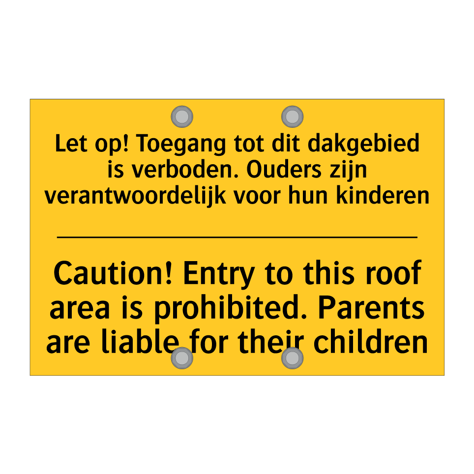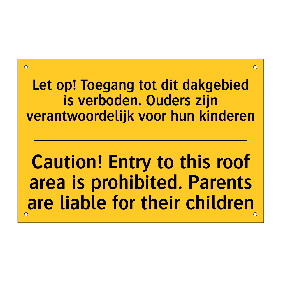 Waarschuwingsbord met de tekst Let op! Toegang tot dit dakgebied is verboden. Ouders zijn verantwoordelijk voor hun kinderen / Caution! Entry to this roof area is prohibited. Parents are liable for their children