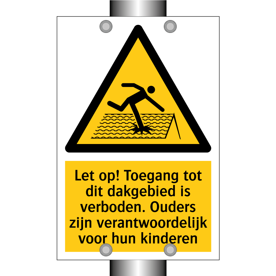 Waarschuwingsbord met de tekst Let op! Toegang tot dit dakgebied is verboden. Ouders zijn verantwoordelijk voor hun kinderen