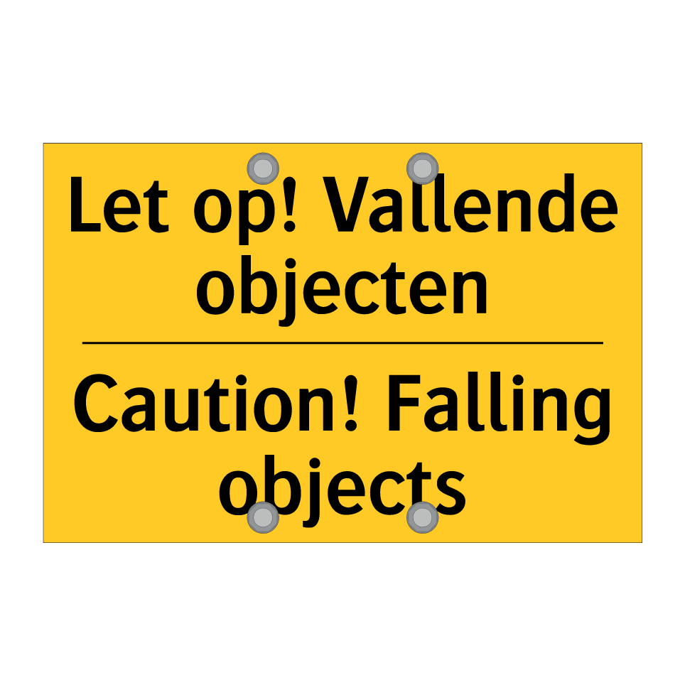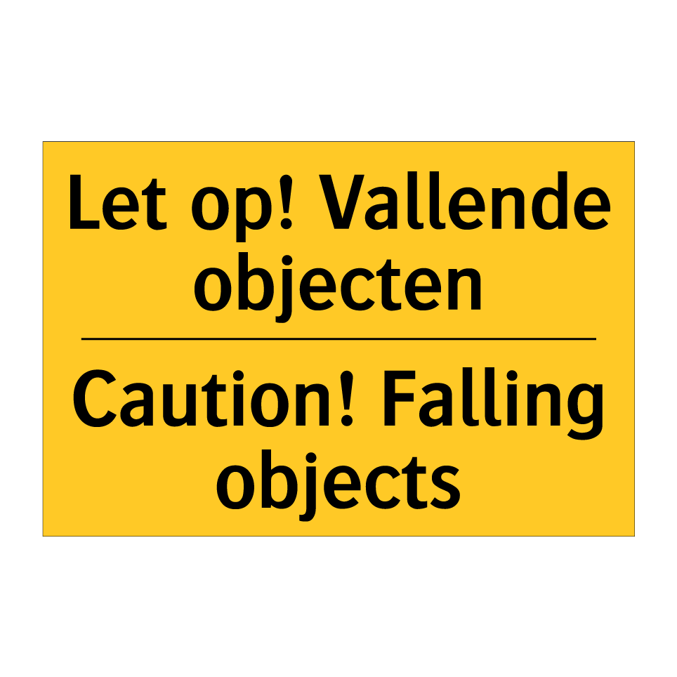 Waarschuwingsbord met de tekst Let op! Vallende objecten / Caution! Falling objects