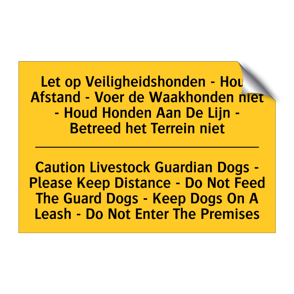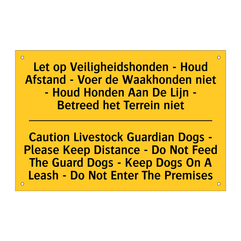 Waarschuwingsbord met de tekst Let op Veiligheidshonden - Houd Afstand - Voer de Waakhonden niet - Houd Honden Aan De Lijn - Betreed het Terrein niet / Caution Livestock Guardian Dogs - Please Keep Distance - Do Not Feed The Guard Dogs - Keep Dogs On A Leash - Do Not Enter The Premises