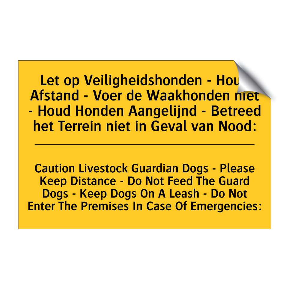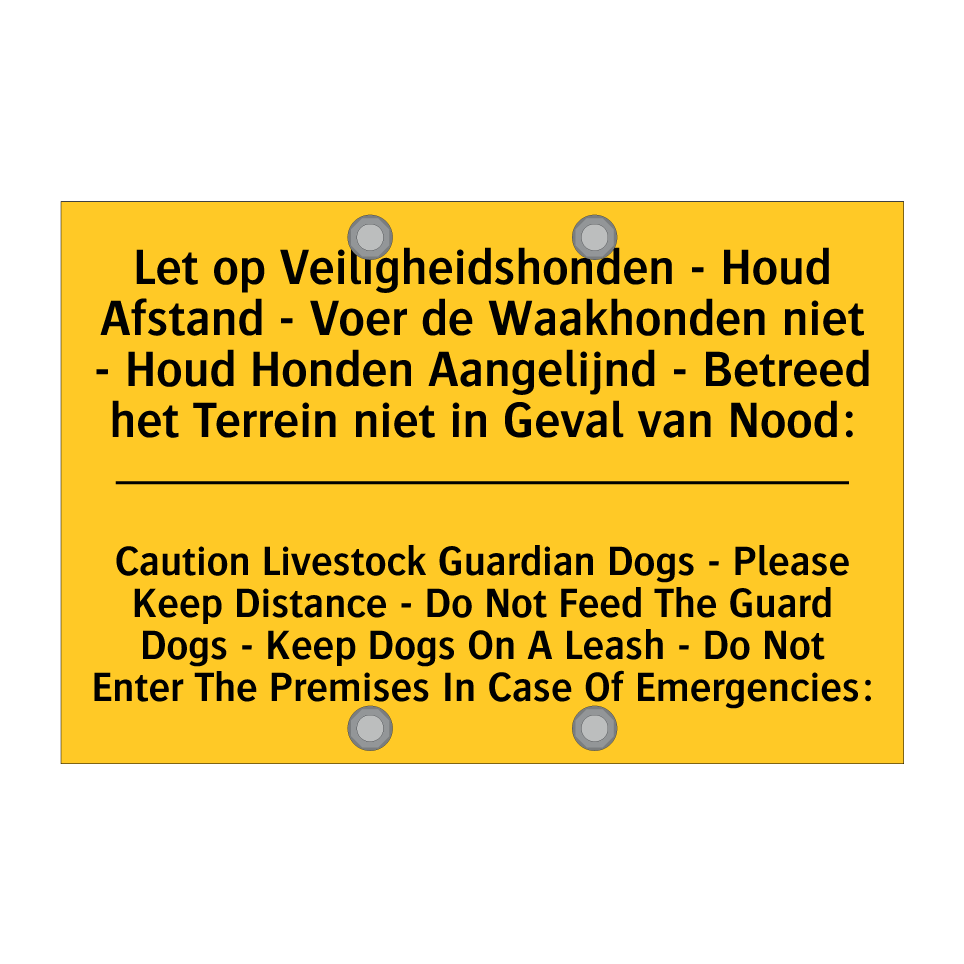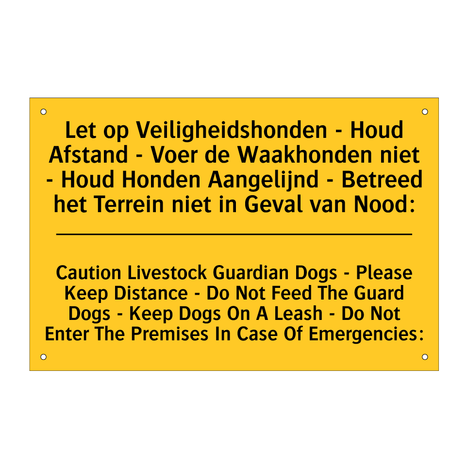 Waarschuwingsbord met de tekst Let op Veiligheidshonden - Houd Afstand - Voer de Waakhonden niet - Houd Honden Aangelijnd - Betreed het Terrein niet in Geval van Nood: / Caution Livestock Guardian Dogs - Please Keep Distance - Do Not Feed The Guard Dogs - Keep Dogs On A Leash - Do Not Enter The Premises In Case Of Emergencies: