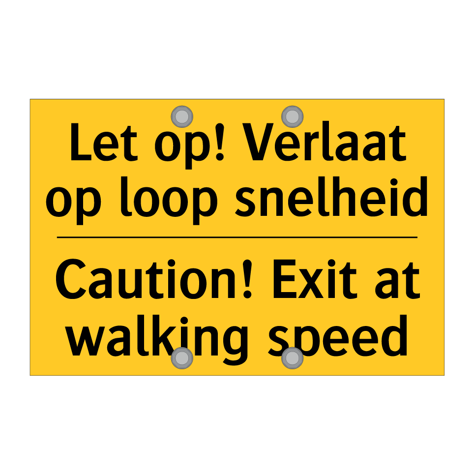 Waarschuwingsbord met de tekst Let op! Verlaat op loop snelheid / Caution! Exit at walking speed
