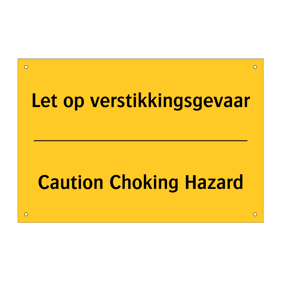 Waarschuwingsbord met de tekst Let op verstikkingsgevaar / Caution Choking Hazard