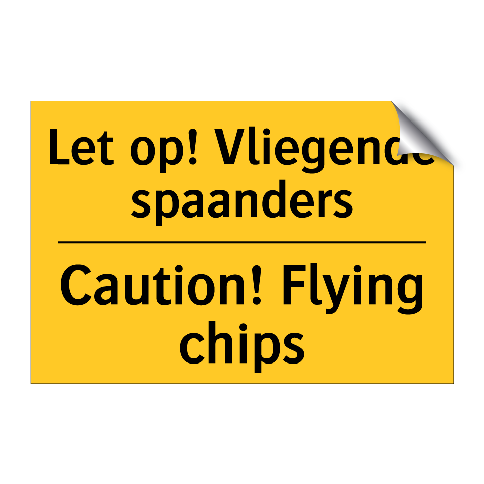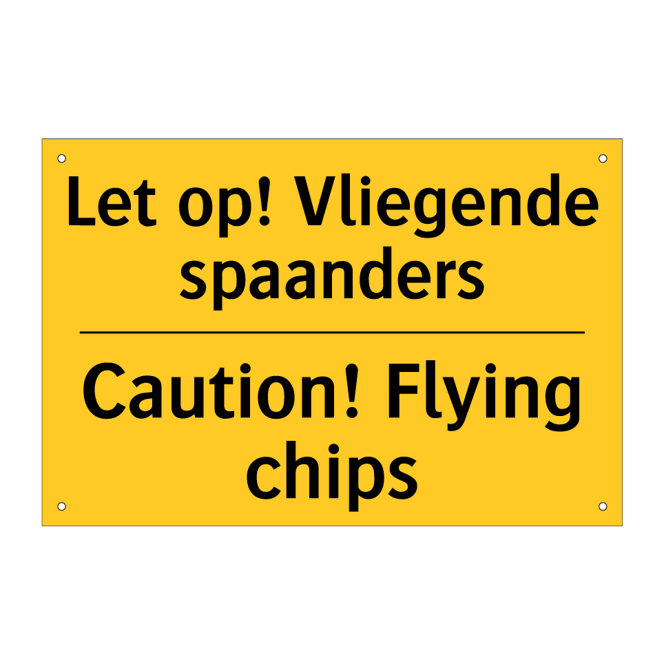 Waarschuwingsbord met de tekst Let op! Vliegende spaanders / Caution! Flying chips