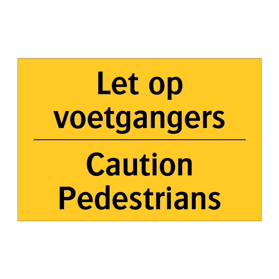 Waarschuwingsbord met de tekst Let op voetgangers / Caution Pedestrians