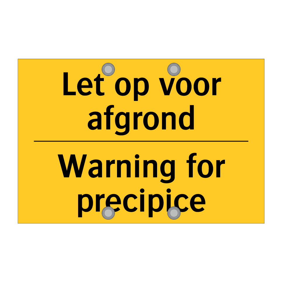 Dit waarschuwingsbord met een gele achtergrond en zwarte tekst is ideaal voor het markeren van gevaarlijke afgronden. De tweetalige tekst in zowel Nederlands als Engels zorgt ervoor dat zowel lokale bewoners als internationale bezoekers de waarschuwing begrijpen. dit bordje is perfect voor gebruik in natuurgebieden, wandelpaden, kliffen en andere risicovolle locaties waar een afgrond aanwezig is. Door de duidelijke en opvallende kleuren trekt het direct de aandacht en helpt het ongelukken te voorkomen. Plaats dit waarschuwingsbord op strategische plekken om de veiligheid van iedereen te waarborgen.