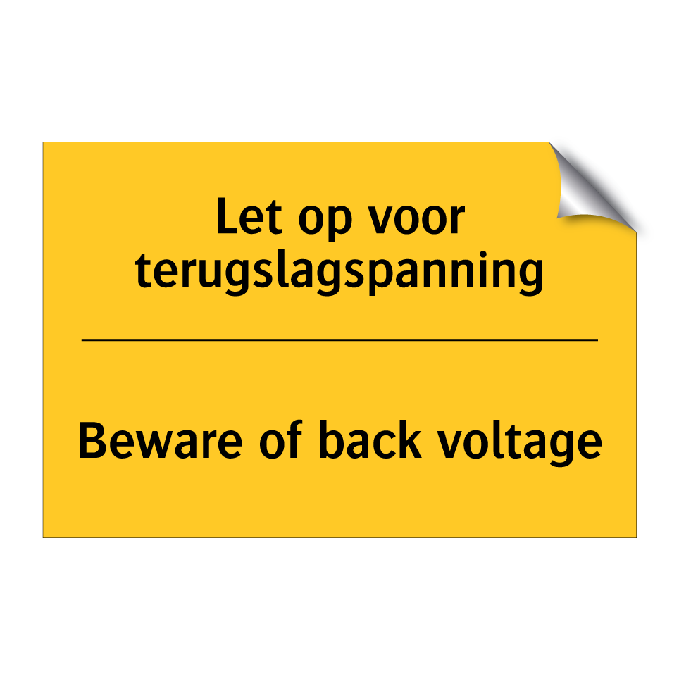 Waarschuwingsbord met de tekst Let op voor terugslagspanning / Beware of back voltage