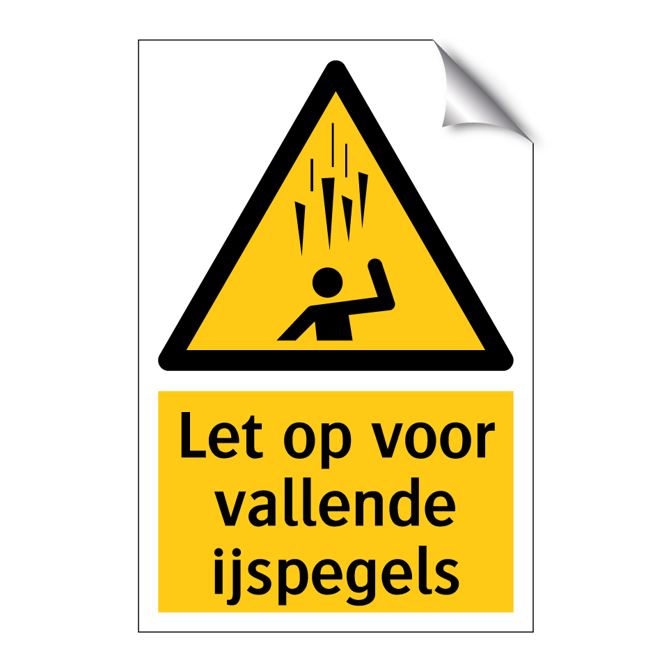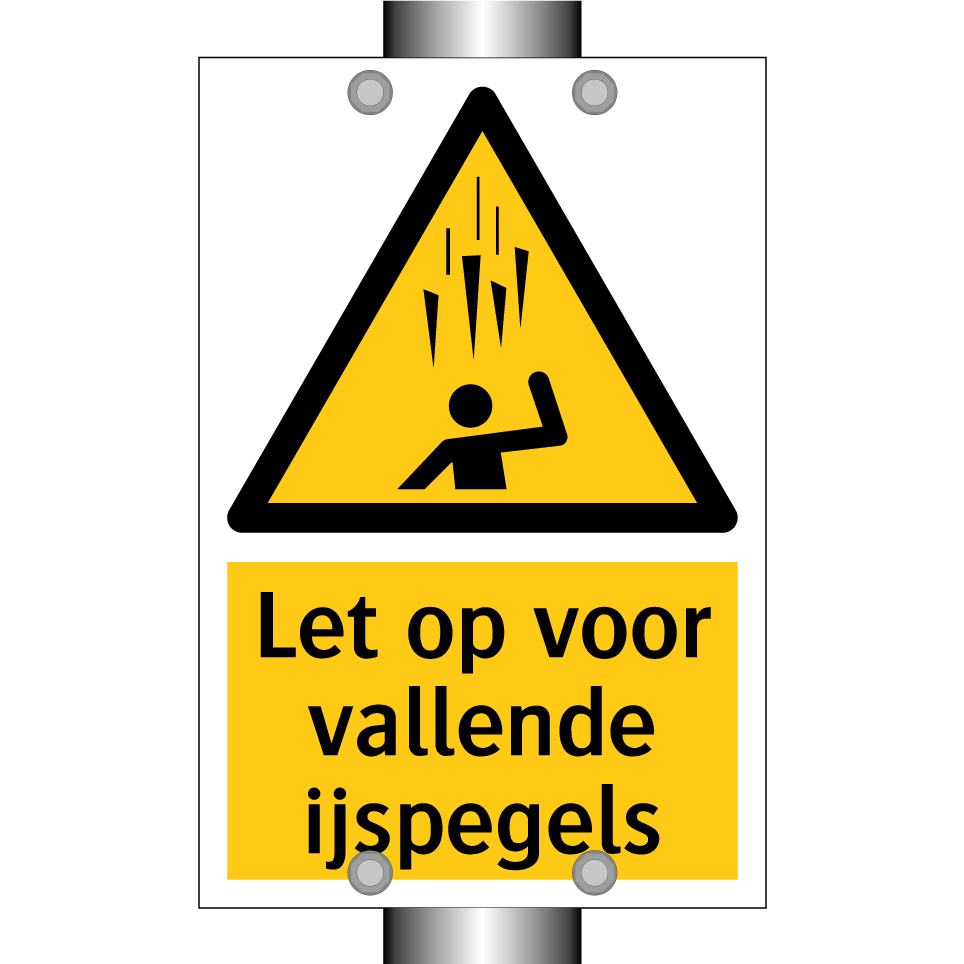 Waarschuwingsbord met de tekst Let op voor vallende ijspegels