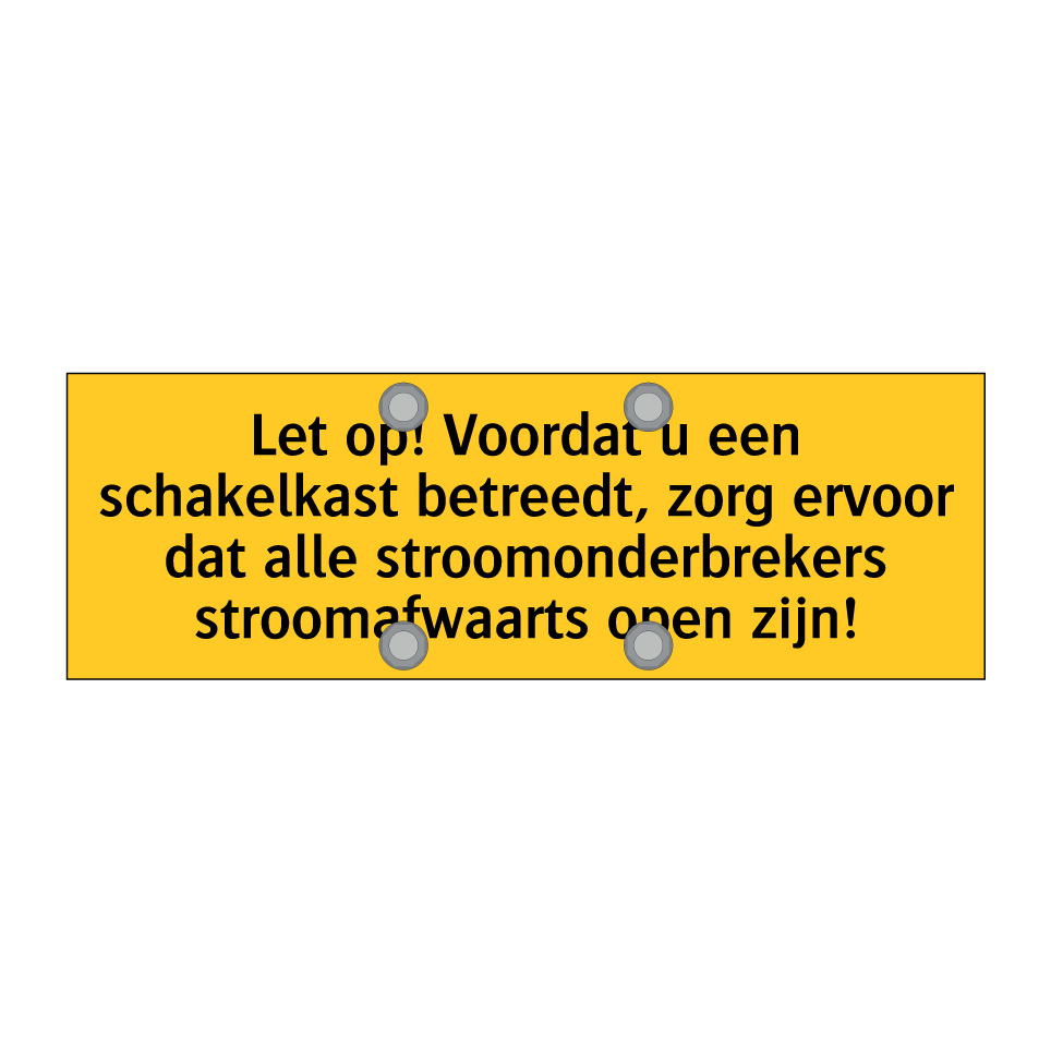 Waarschuwingsbord met de tekst Let op! Voordat u een schakelkast betreedt, zorg ervoor dat alle stroomonderbrekers stroomafwaarts open zijn!