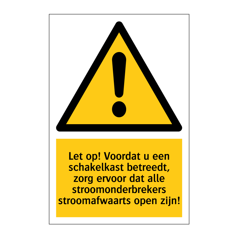 Waarschuwingsbord met de tekst Let op! Voordat u een schakelkast betreedt, zorg ervoor dat alle stroomonderbrekers stroomafwaarts open zijn!