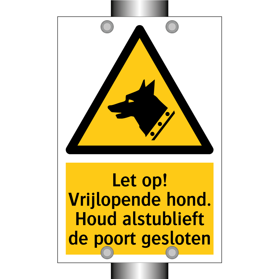 Waarschuwingsbord met de tekst Let op! Vrijlopende hond. Houd alstublieft de poort gesloten