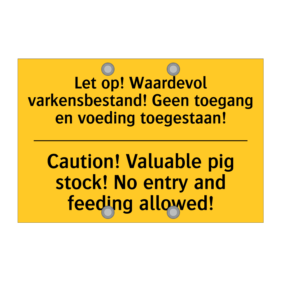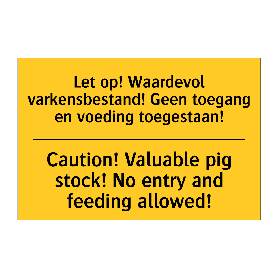 Waarschuwingsbord met de tekst Let op! Waardevol varkensbestand! Geen toegang en voeding toegestaan! / Caution! Valuable pig stock! No entry and feeding allowed!