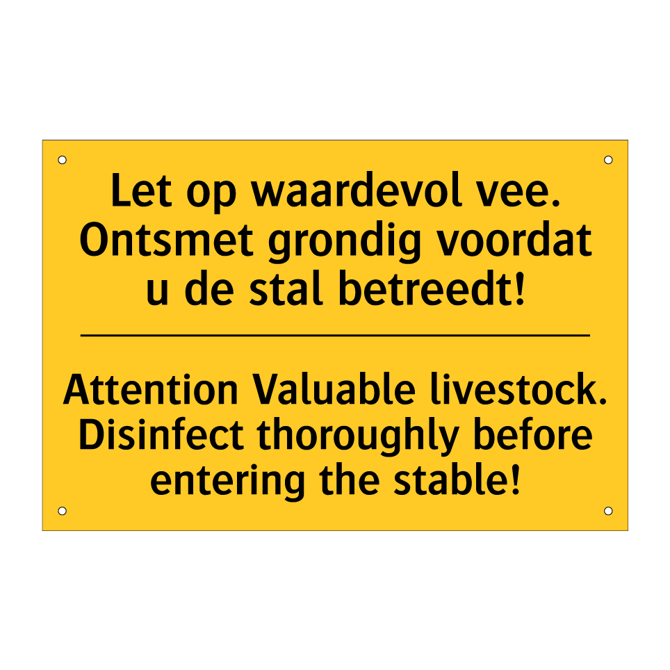 Waarschuwingsbord met de tekst Let op waardevol vee. Ontsmet grondig voordat u de stal betreedt! / Attention Valuable livestock. Disinfect thoroughly before entering the stable!