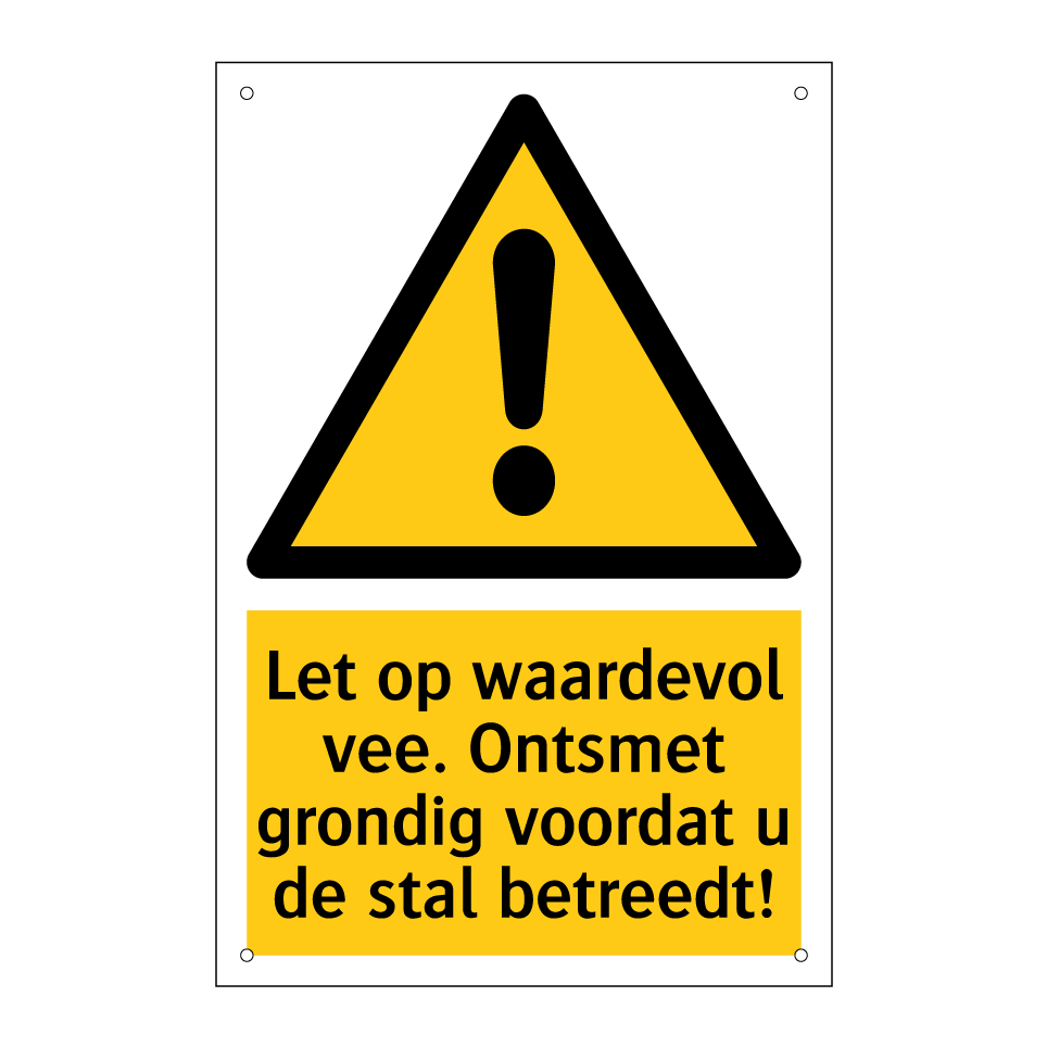Waarschuwingsbord met de tekst Let op waardevol vee. Ontsmet grondig voordat u de stal betreedt!