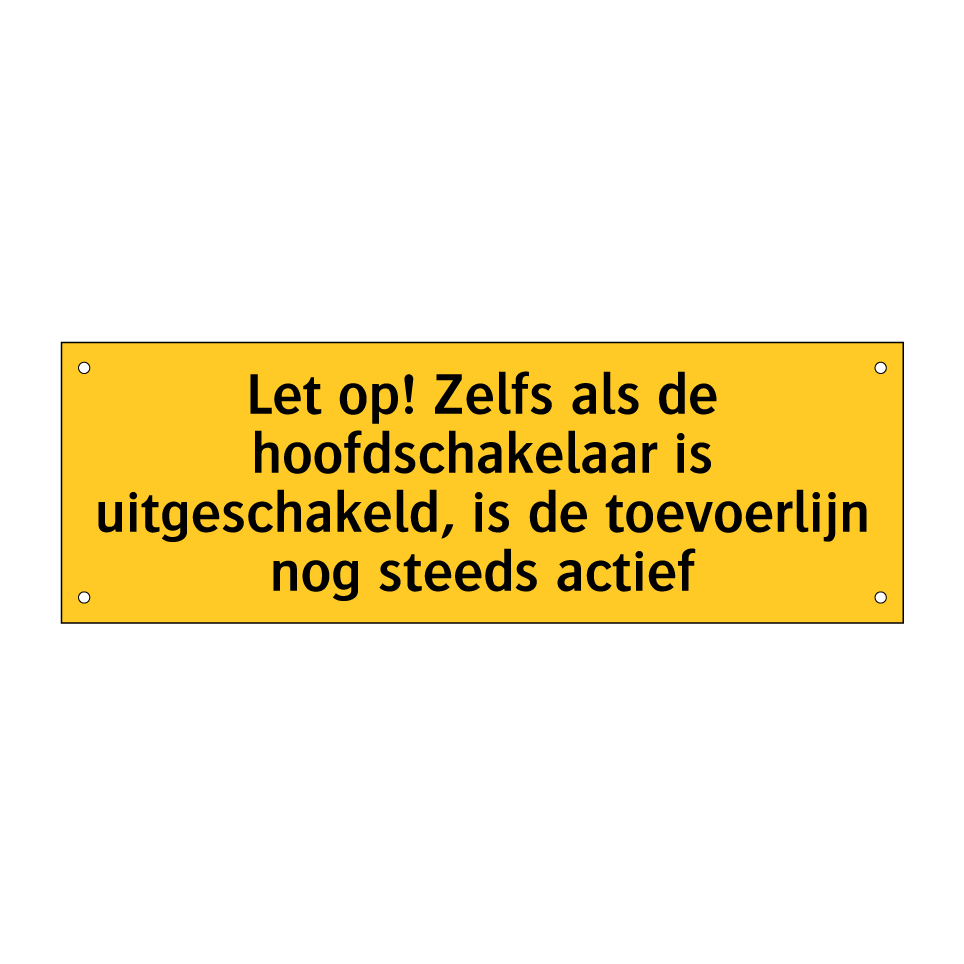 Waarschuwingsbord met de tekst Let op! Zelfs als de hoofdschakelaar is uitgeschakeld, is de toevoerlijn nog steeds actief