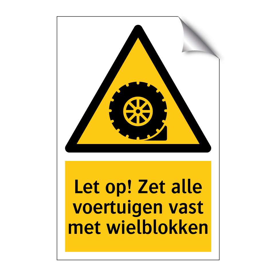 Waarschuwingsbord met de tekst Let op! Zet alle voertuigen vast met wielblokken