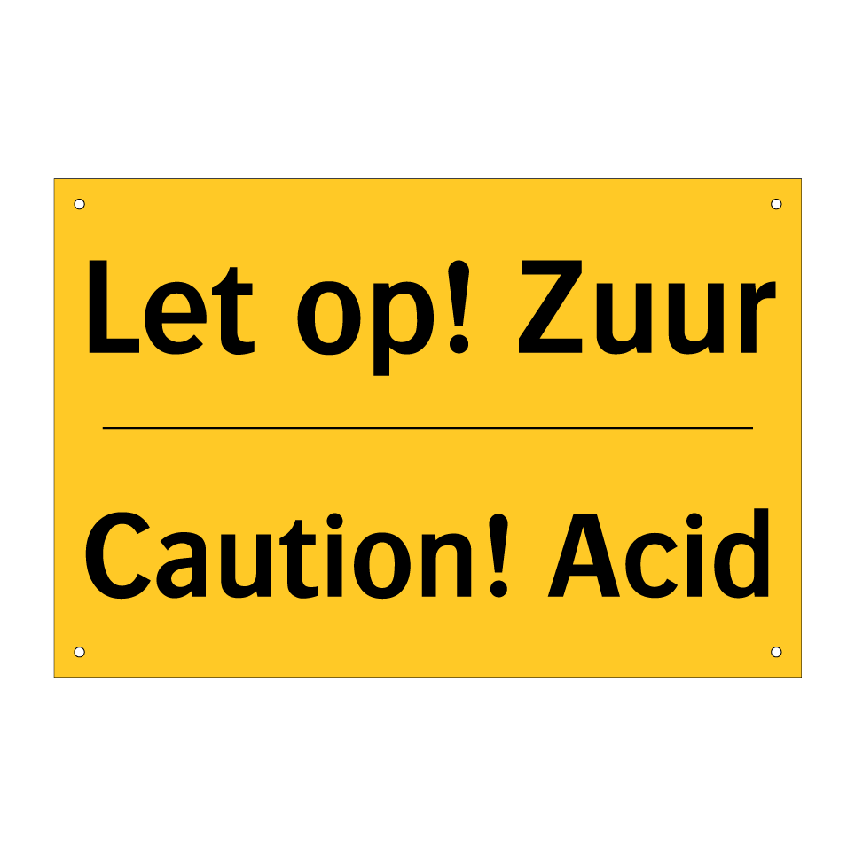 Waarschuwingsbord met de tekst Let op! Zuur / Caution! Acid