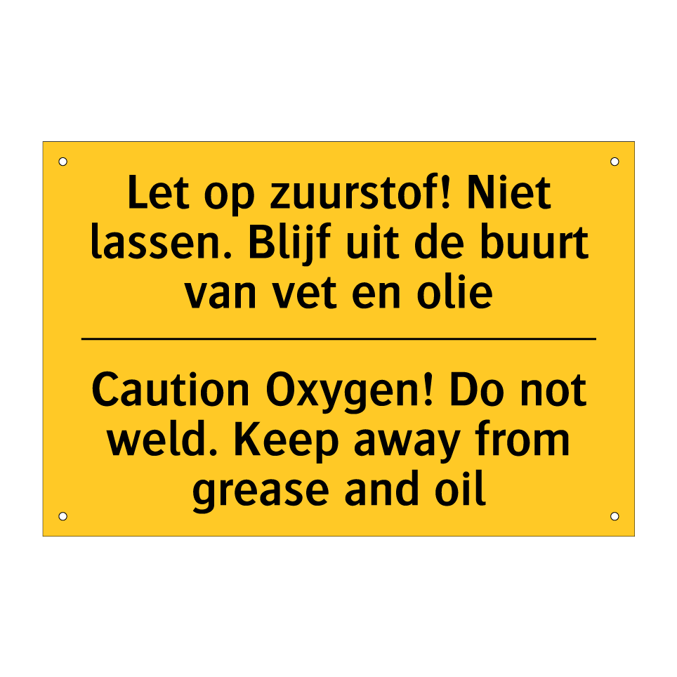 Waarschuwingsbord met de tekst Let op zuurstof! Niet lassen. Blijf uit de buurt van vet en olie / Caution Oxygen! Do not weld. Keep away from grease and oil
