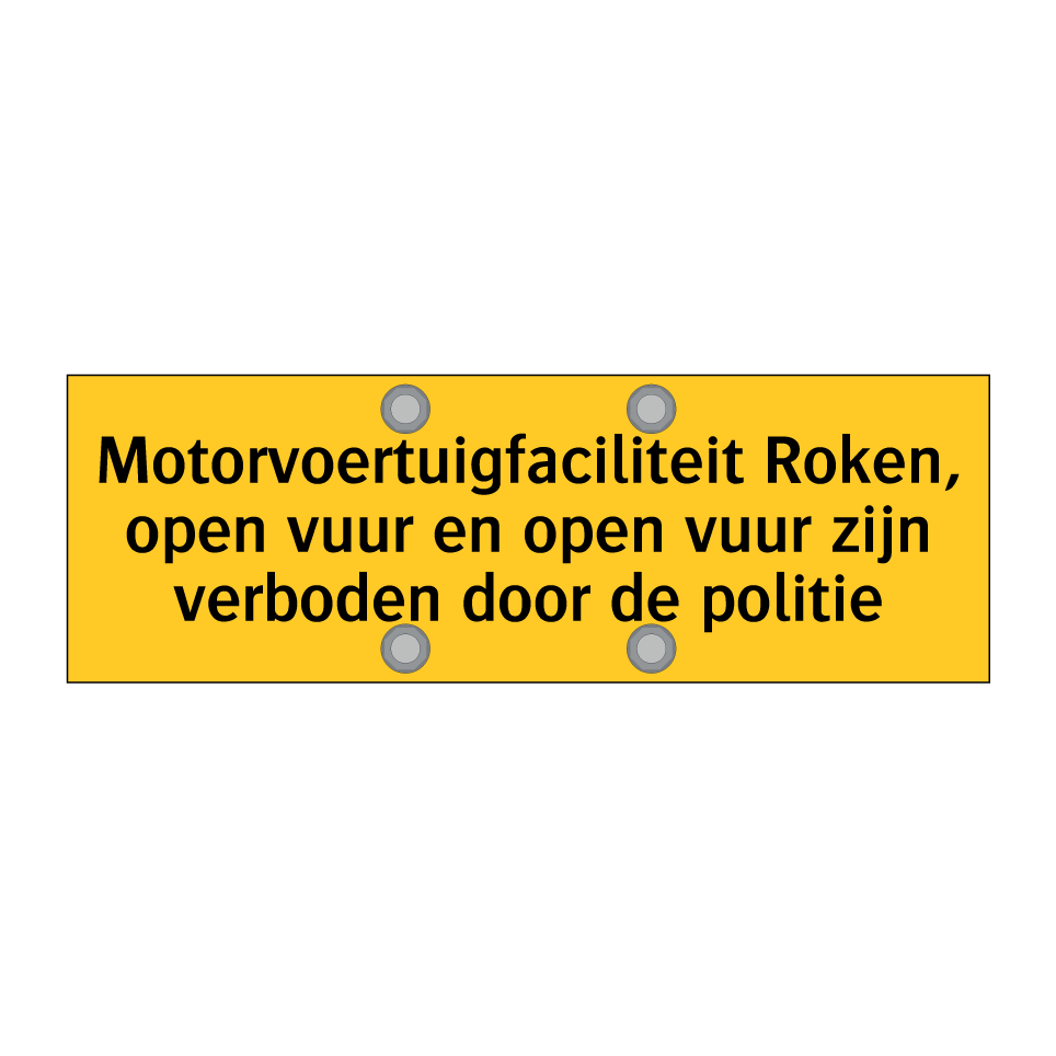 Waarschuwingsbord met de tekst Motorvoertuigfaciliteit Roken, open vuur en open vuur zijn verboden door de politie